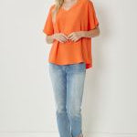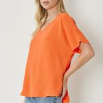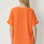 Solid v-neck top featuring asymmetric rounded hem detail. Unlined. Semi-sheer. Woven. Lightweight.