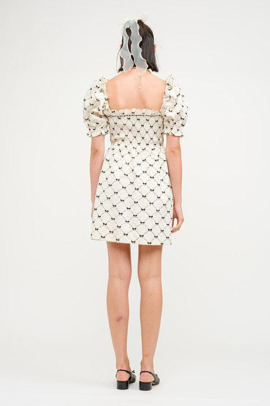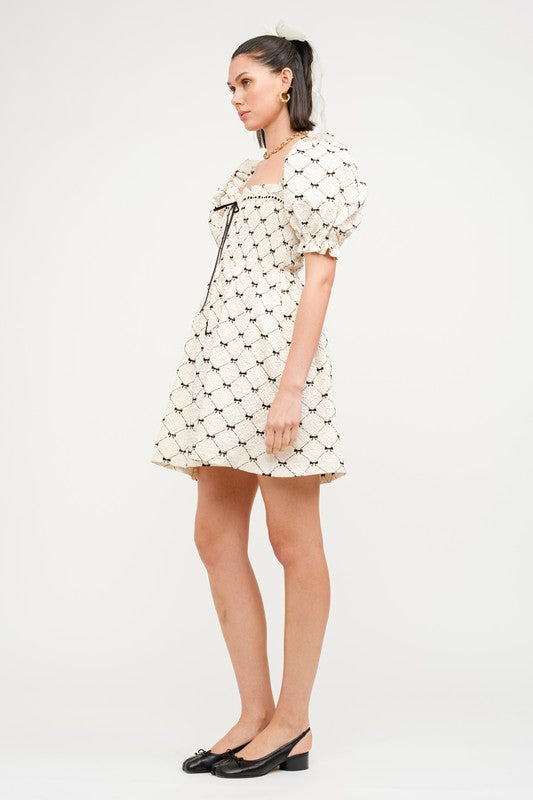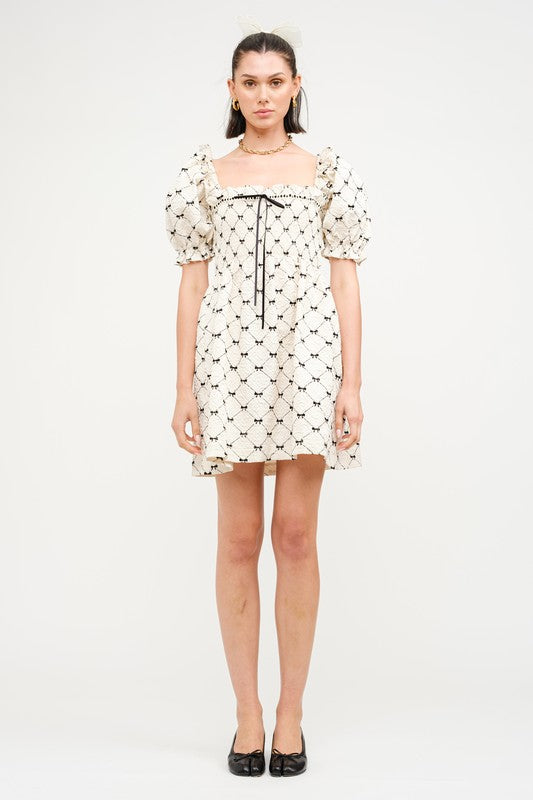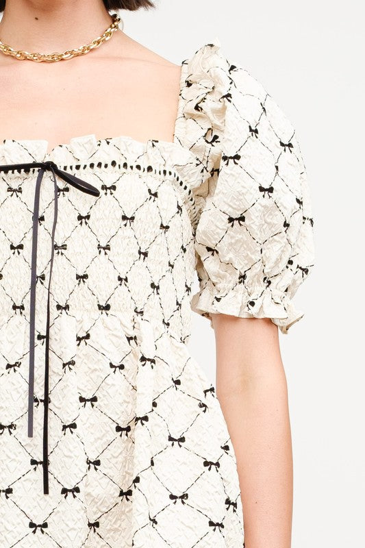 Imagine twirling in a mini babydoll dress that captures that perfect blend of playful and pretty. The dress features adorable puff sleeves that add a touch of vintage charm, giving it a fun, flirty vibe. Delicate mini bows scattered throughout the fabric bring an extra dose of whimsy, making it feel special and unique. The flowy silhouette is super comfortable, perfect for a sunny day out or a casual brunch with friends. Pair it with some cute sandals or ankle boots, and you’re ready to embrace your inner free spirit while looking effortlessly chic!