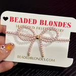 Bows? We love her! Get our iconic pearl bow bracelet to add to your stack. Made from imitation pale pink pearls & 14k gold beads so it’s perfect for everyday wear! Sweat proof, waterproof and tarnish free! Hand strung with love in College Station, Texas.