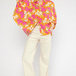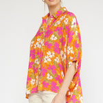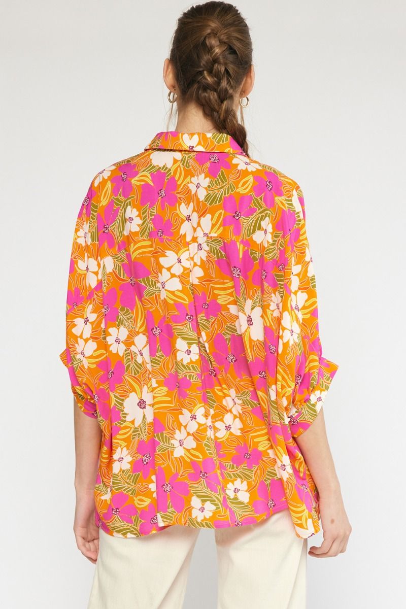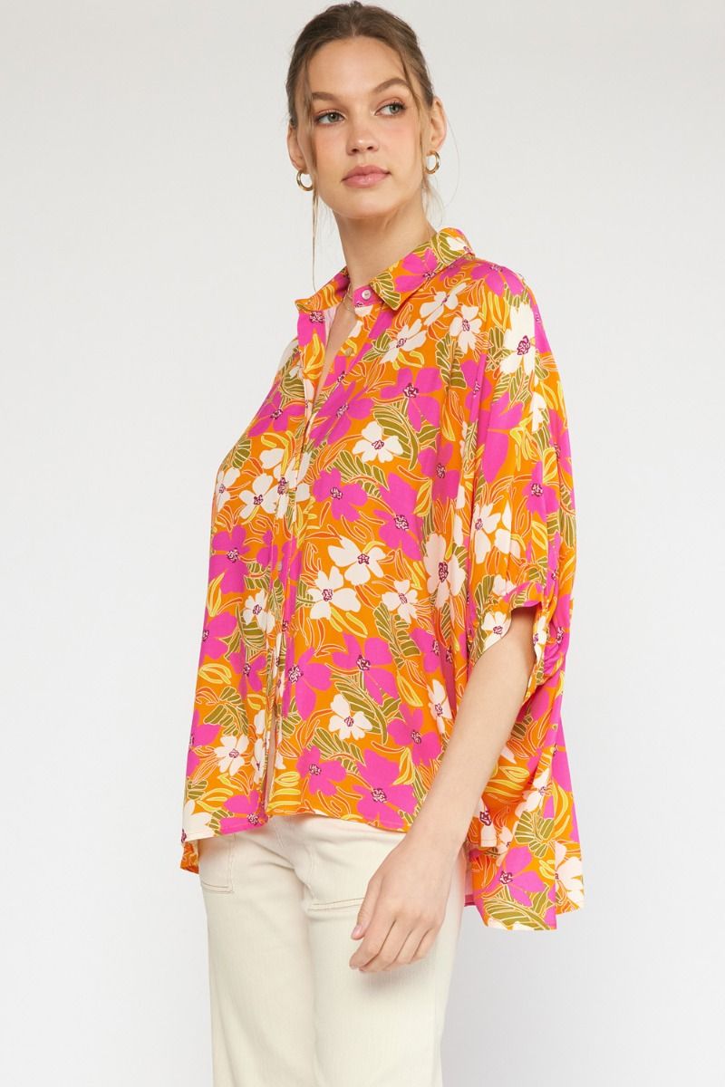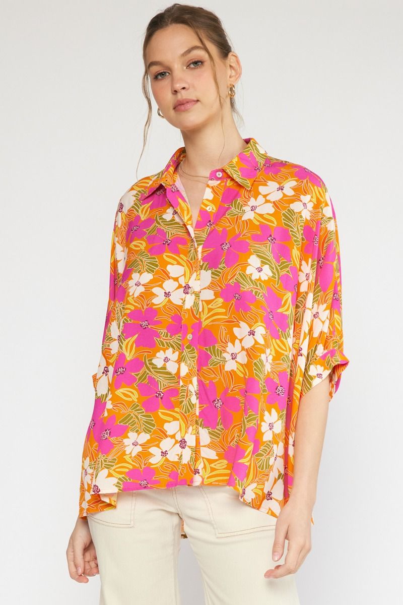 Floral print button up collared 3/4 sleeve top. Unlined. Woven. Non-sheer. Lightweight.