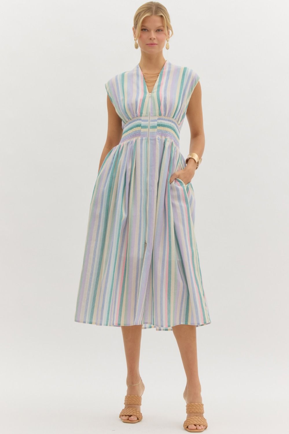 This multicolor stripe sleeveless midi dress is the perfect mix of comfort and style. Featuring a front zip-up detail for an easy, adjustable fit, it also has handy side pockets for those "I need to carry something" moments. The smocked waist adds a flattering shape, while the lightweight, lined woven fabric keeps it breezy and non-sheer, so you can wear it with confidence all day. Whether you're heading to brunch or a casual day out, this dress is the go-to choice for effortless chic.