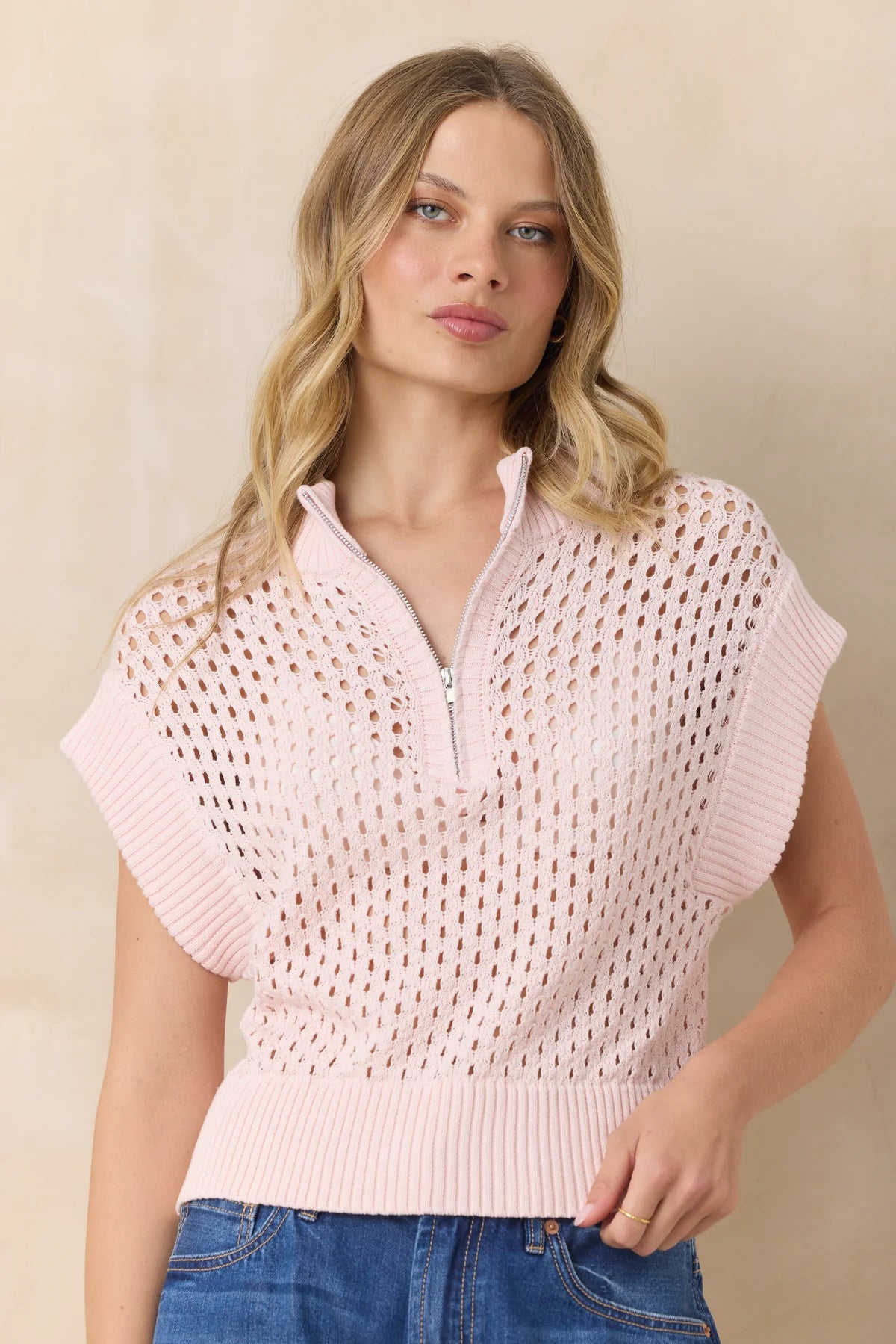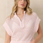 Lightweight and breezy, this short sleeve open knit quarter zip sweater is your go-to for warm weather layering with effortless style. The loose, airy knit construction lets air flow freely, keeping you cool while adding texture and dimension to any outfit. Slip it on over a tank or wear it solo for that relaxed, sun-soaked look. Whether you're strolling the boardwalk or enjoying a casual evening, this piece captures that carefree coastal spirit perfectly.