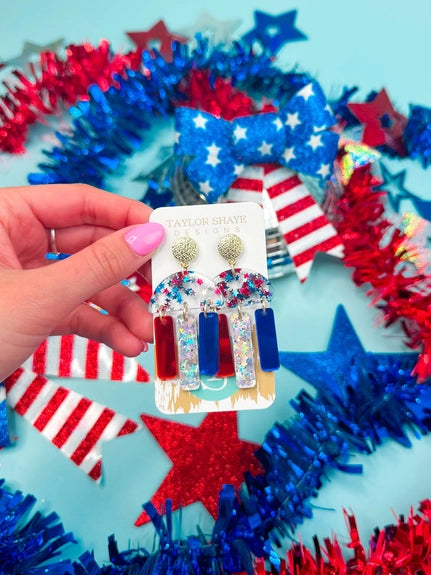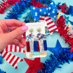 Embrace a star-spangled style with these striking Acrylic Earrings, designed to capture the essence of patriotism with every sway. Crafted from clear acrylic, these earrings feature a captivating stars nestled at the stud, symbolizing the guiding light of freedom. Below, three dangles in vibrant red, crisp white, and deep blue cascade elegantly, echoing the colors of the American flag in a contemporary and playful fashion.