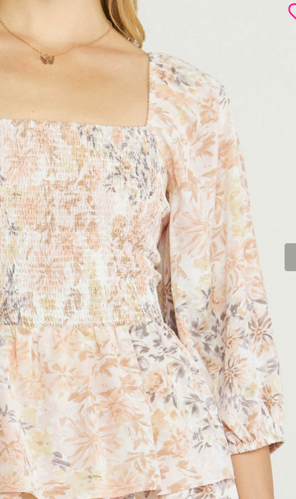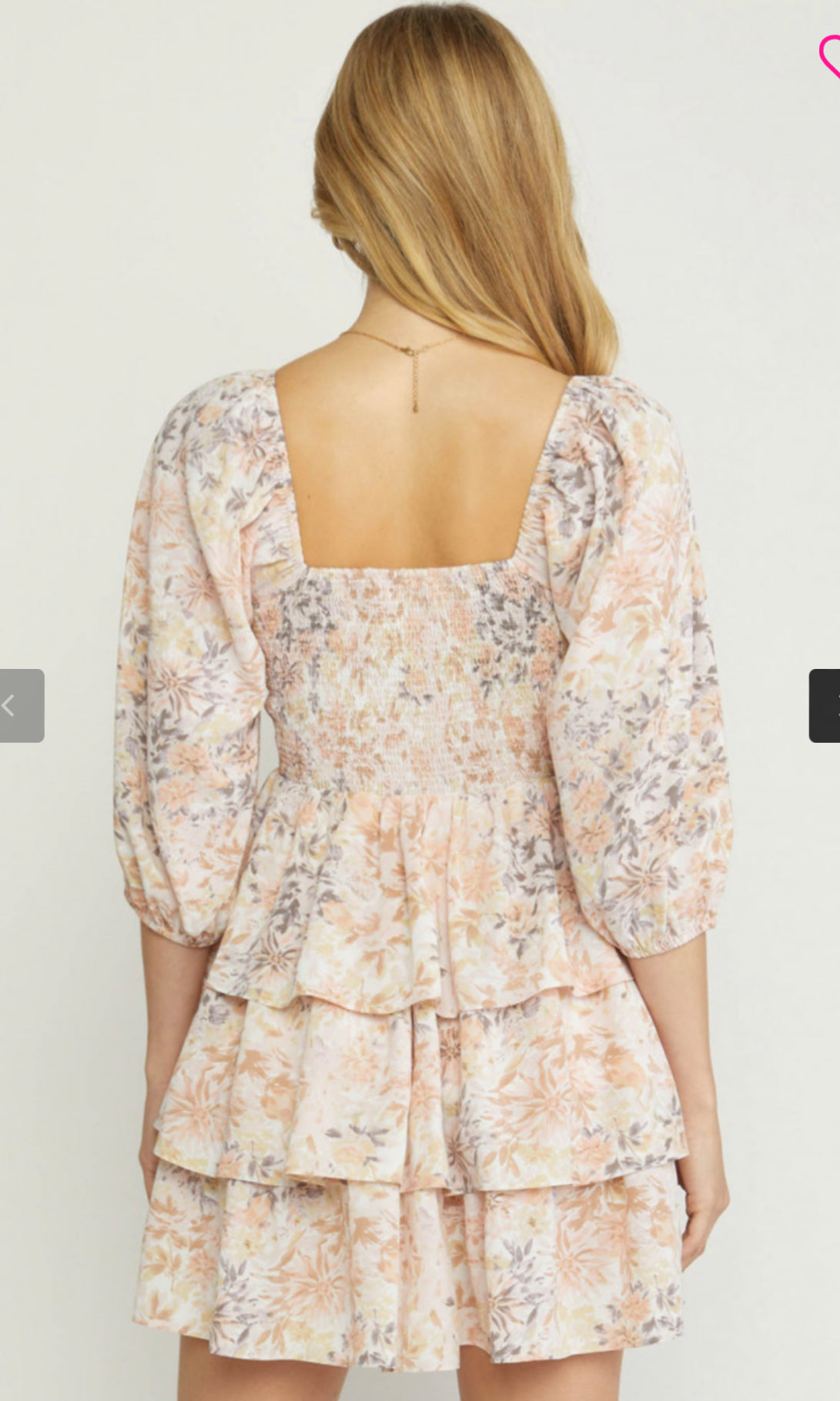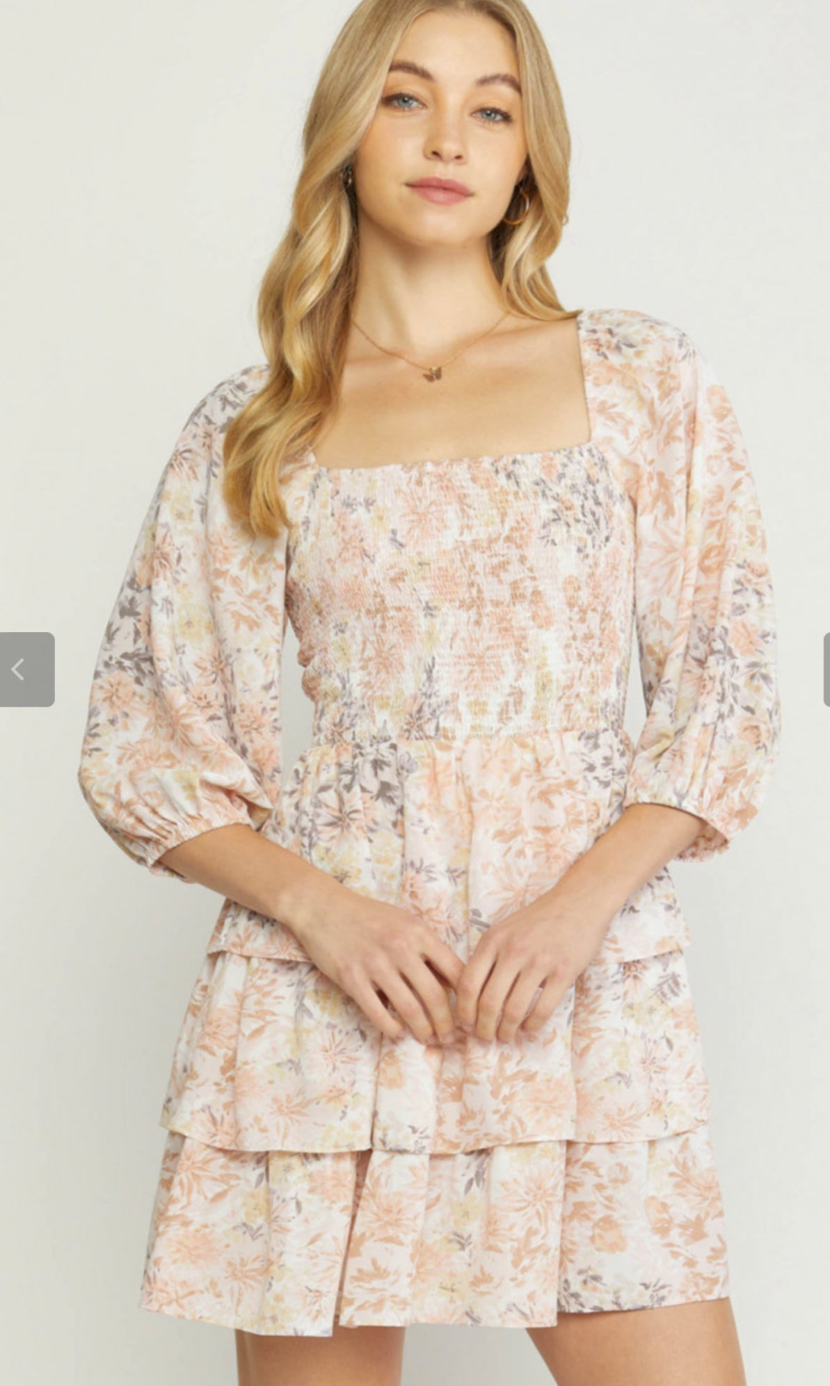 Tiered floral smocked square neck dress featuring elasticized cuff. Lined. Woven. Non-sheer. Lightweight.