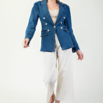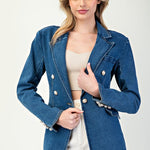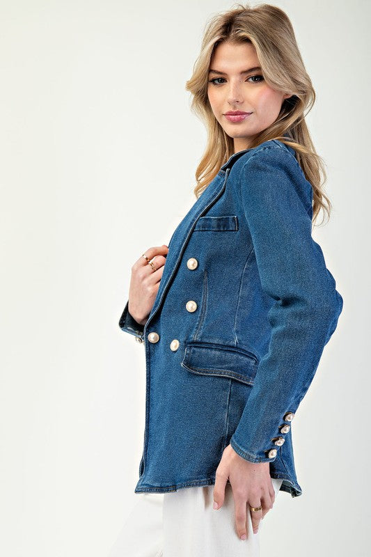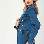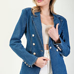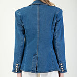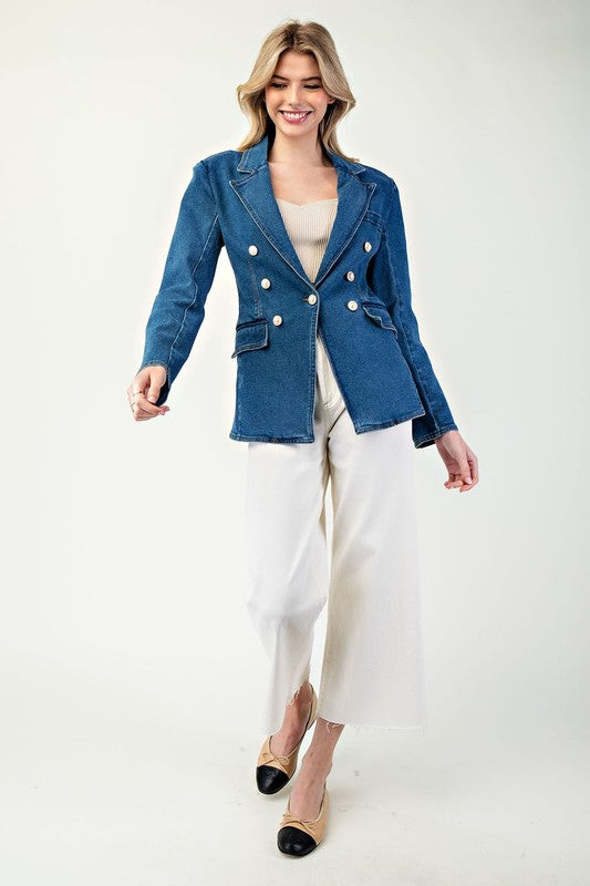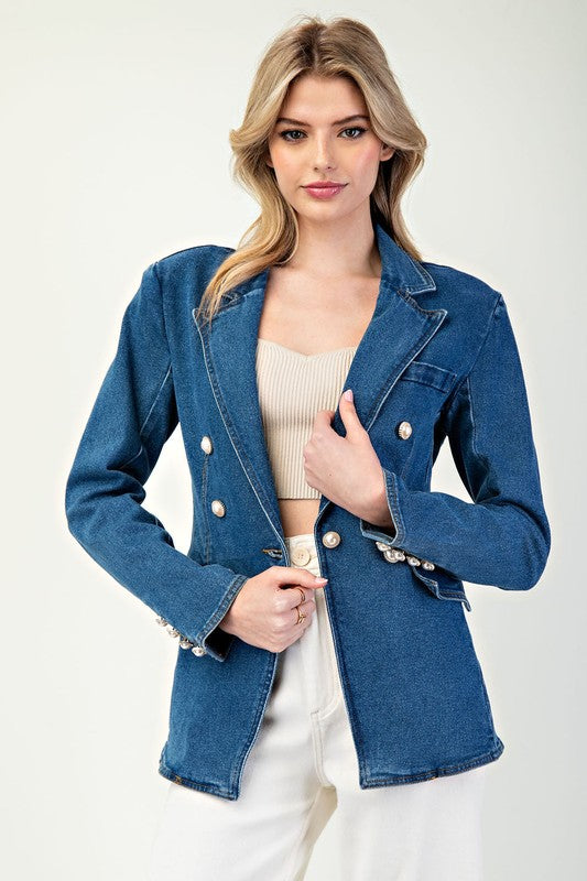 This long-sleeve denim blazer jacket is the perfect mix of classic and chic! The lapel collar and one-button front gives it a polished, tailored look, while the pearl buttons add a stylish, feminine touch that really makes it stand out. Two side flap pockets and a faux chest pocket add some practical flair, and the slight shoulder pads give it that structured, confident vibe. The added seams throughout and the vent in the back make it feel modern and elevated, while the fitted silhouette hugs your shape in all the right ways. Whether you're dressing it up for a night out or pairing it with jeans for a more casual look, this jacket is effortlessly stylish and versatile!