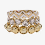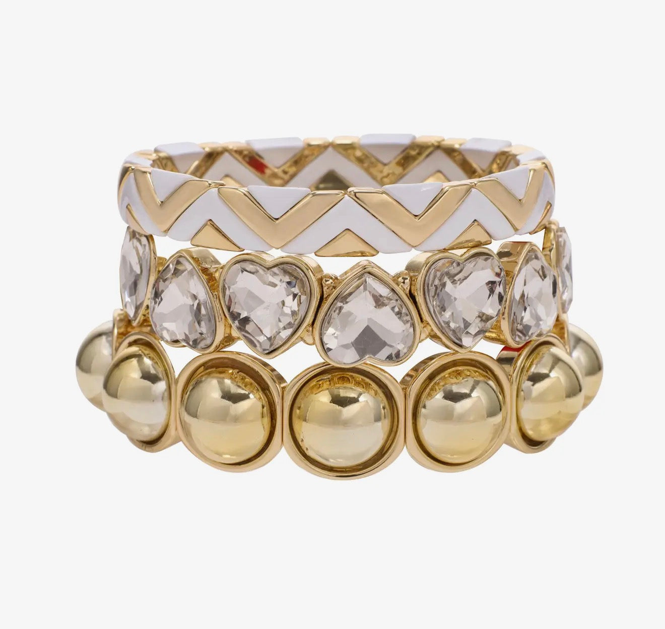 • A little glam, a little romance. Features three beautifully coordinated stretch bracelets designed to shine together or be worn separately. From glossy gold dome beads, to sparkling heart shaped crystals, to a sleek white and gold chevron patter.