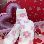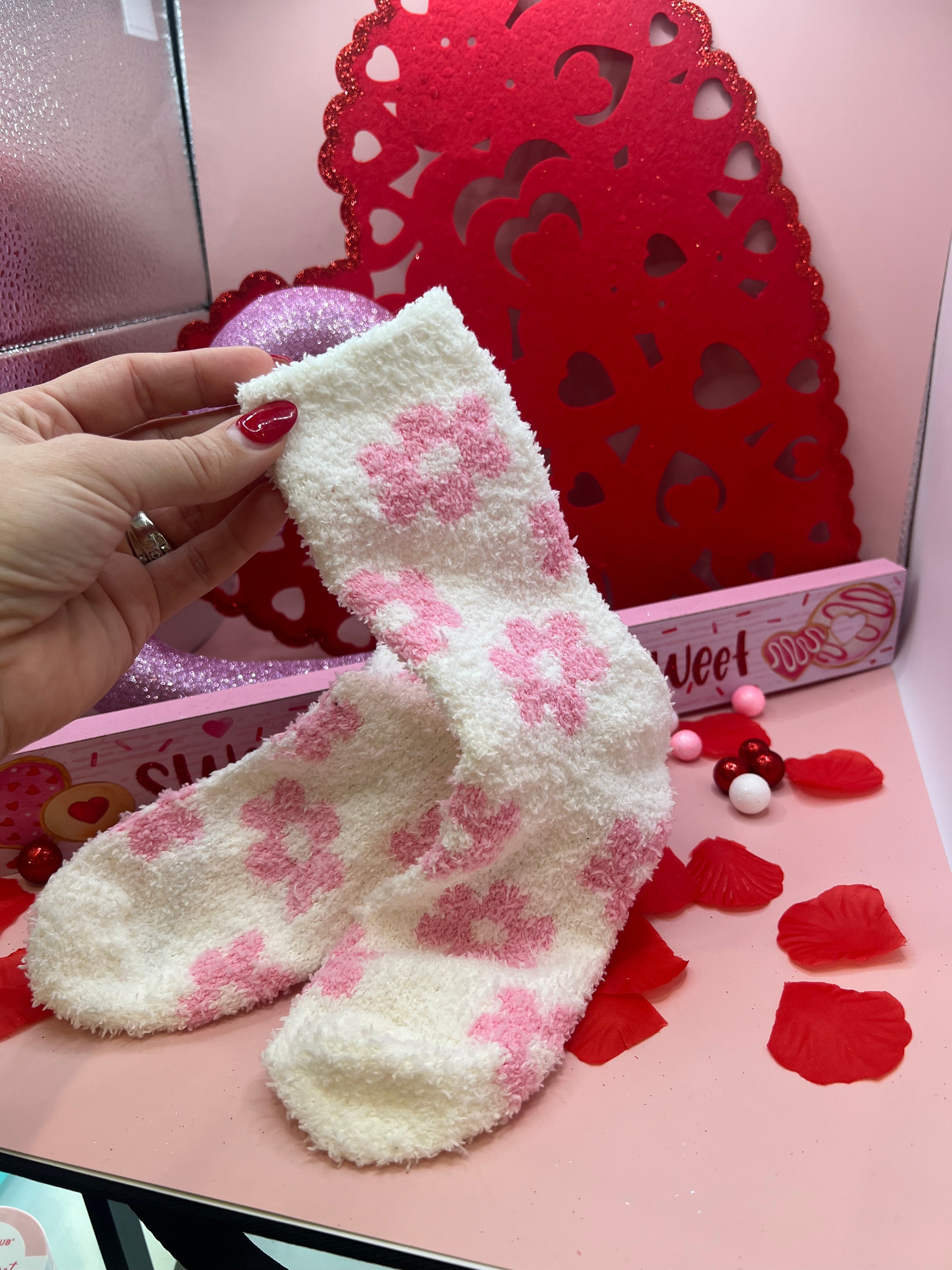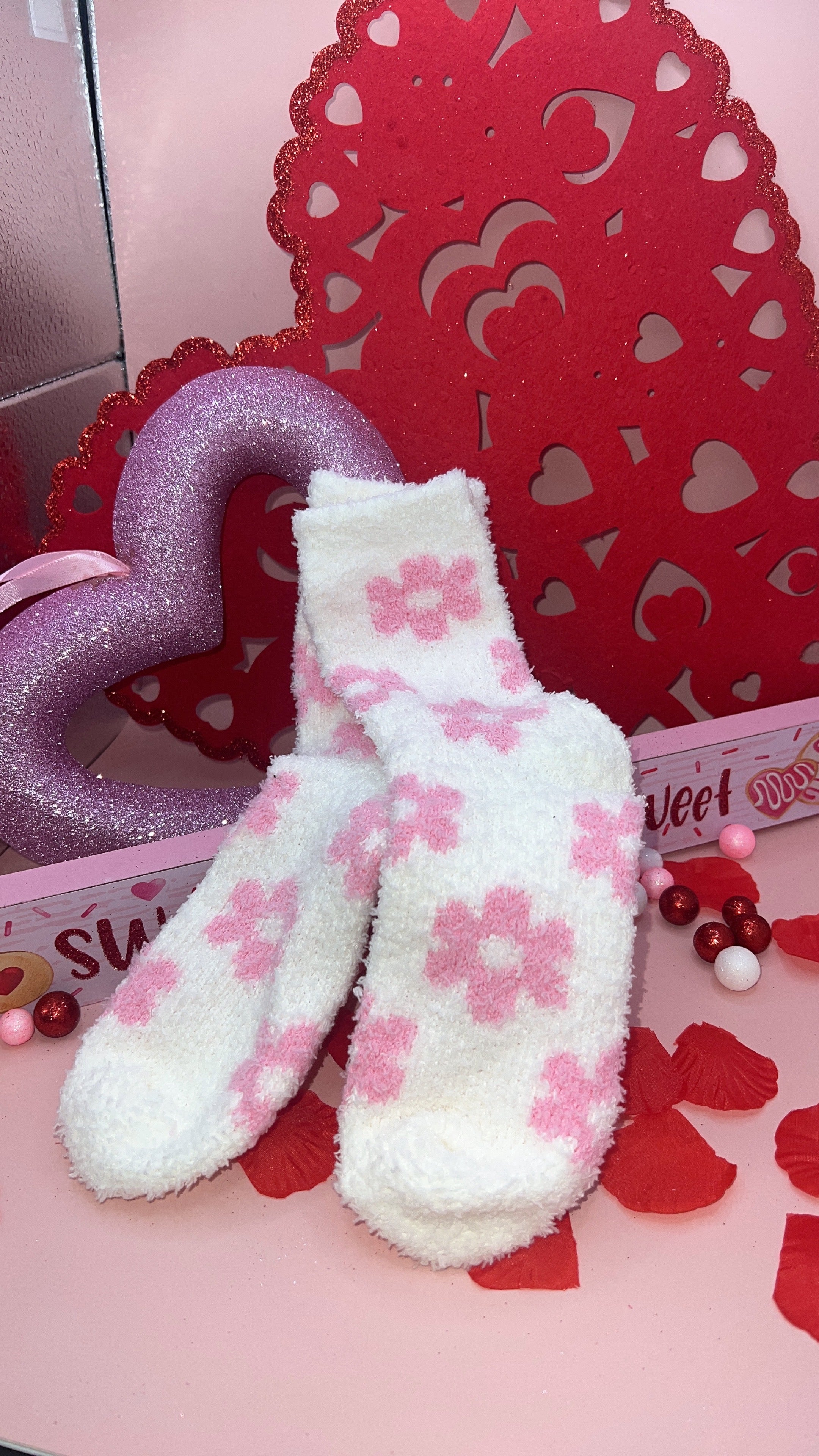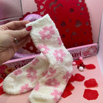 These cozy plush socks in cream showcase a delightful touch of femininity with light pink flowers. The gentle color palette and floral pattern make these socks a charming accessory for those cozy days at home.