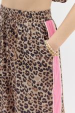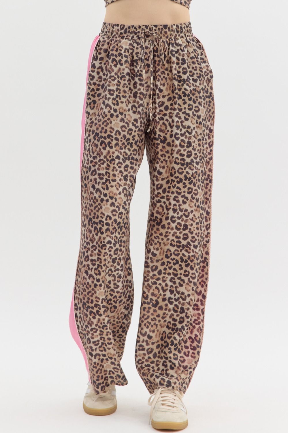 These Leopard Print High-Waisted Wide Leg Pants are a bold and stylish addition to any wardrobe. Featuring a striking leopard print design, they offer a flattering high-waisted fit and wide leg silhouette for ultimate comfort and style. The pants are designed with contrast side accents and accented binding details for a chic and unique touch. An adjustable tie elastic waistband ensures a perfect fit, while side pockets provide added functionality. Fully lined, these lightweight, woven pants are non-sheer, making them ideal for both day and night wear. Perfect for a casual yet fashionable look, these pants are a must-have for your collection.