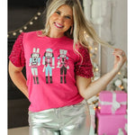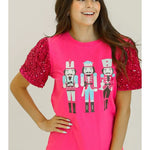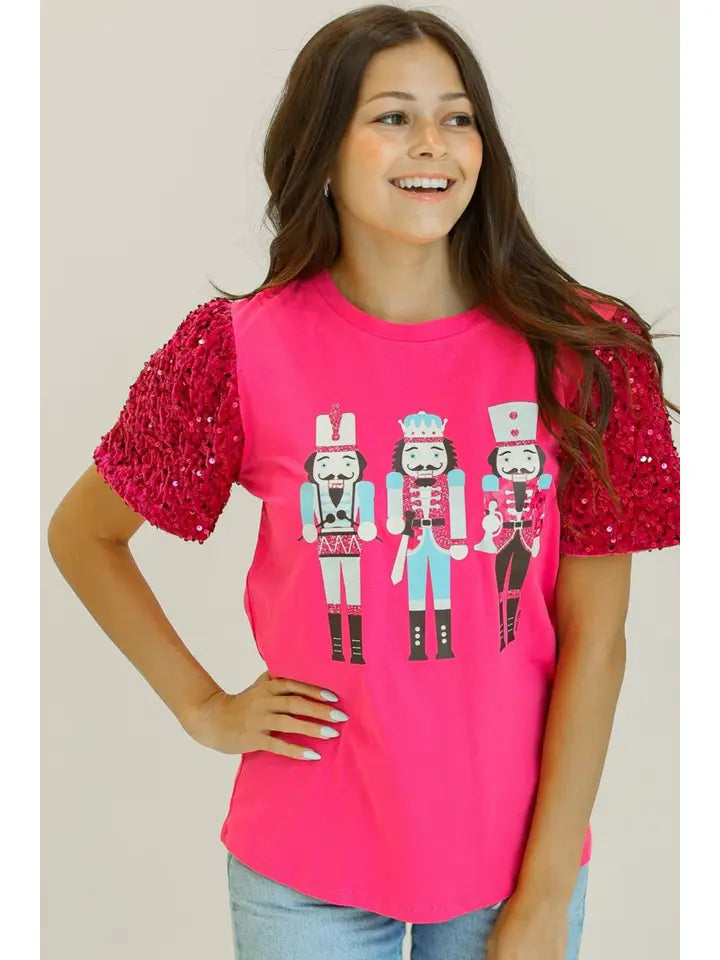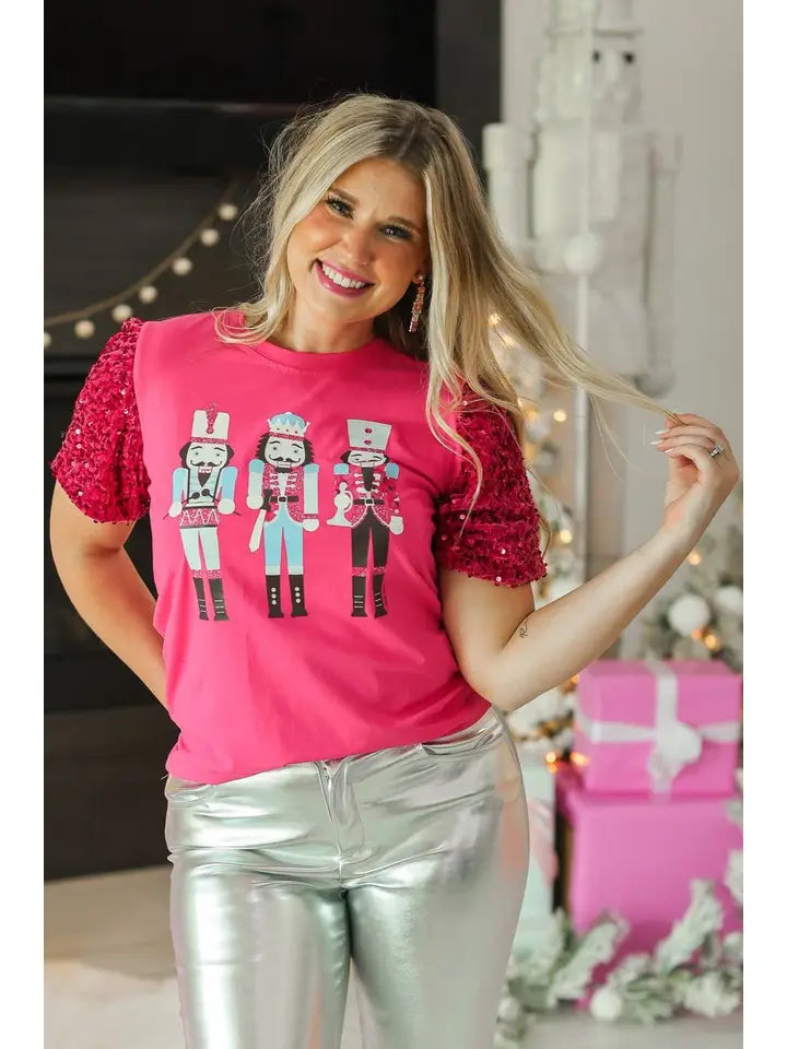 Imagine a playful pink short sleeve top that’s perfect for the holiday season. The body is soft and cozy, while the sleeves are a luxurious velvet, catching the light with every move. They’re adorned with shimmering sequins that sparkle like tiny ornaments. Right on the chest, a whimsical nutcracker design adds a fun and festive touch, making this top a delightful blend of comfort and holiday cheer. It’s the kind of piece that makes you feel festive and fabulous, whether you’re at a family gathering or just sipping cocoa at home!