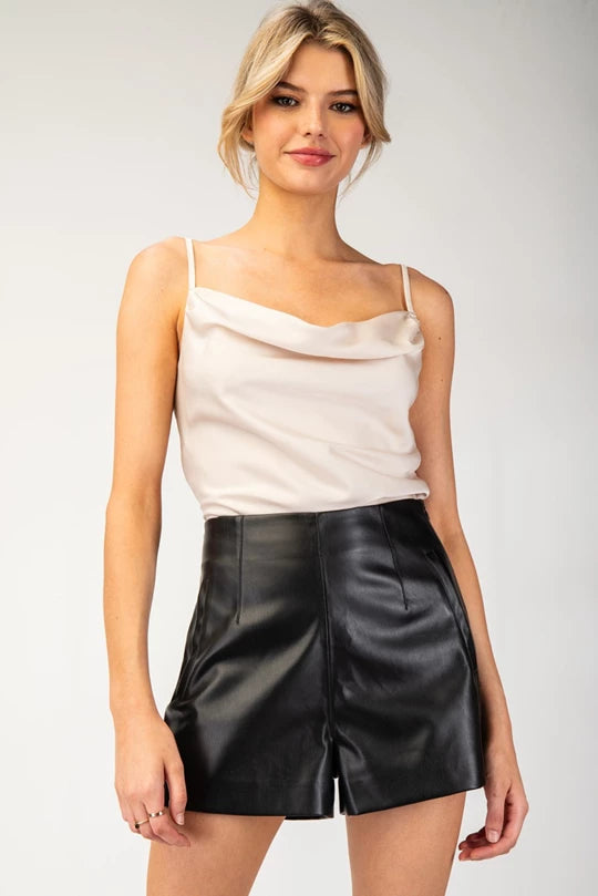 These solid pleather shorts are the perfect blend of edgy and sleek. Featuring two handy side hip pockets, they’re practical while still keeping you looking stylish. The added seams give them a structured, tailored look, and the side zipper closure makes them easy to slip on. With a slightly fitted design, these shorts hug your body in all the right places, giving you that chic, put-together vibe. Whether you’re pairing them with a casual tee or dressing them up with a blouse and heels, these shorts are your go-to for effortless style with an edge.