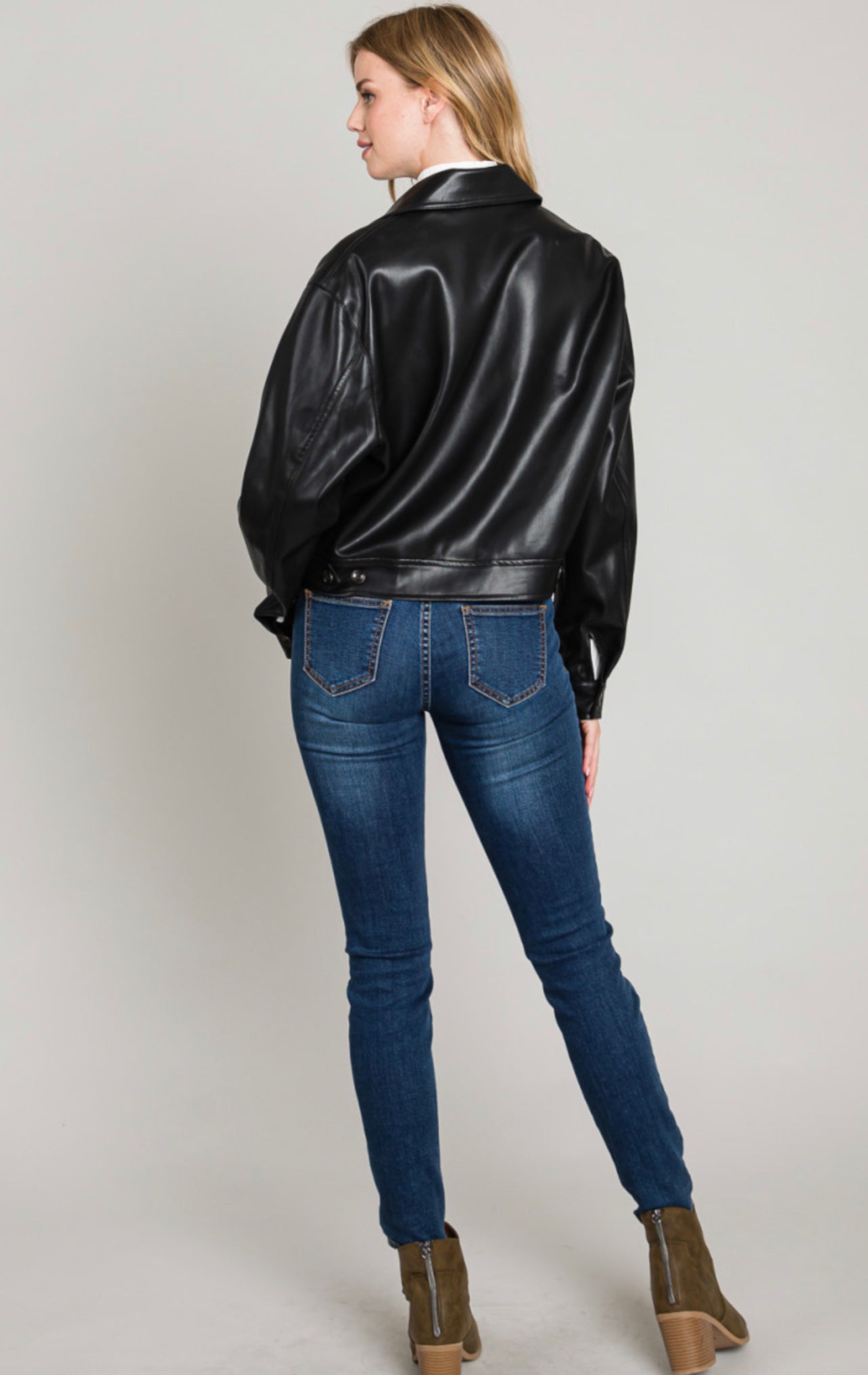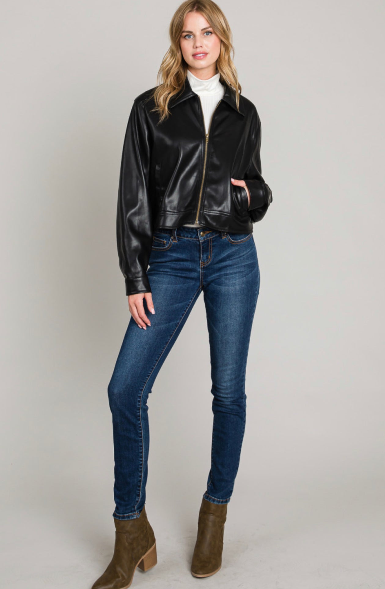 Soft Pleather Zipper Front Collared Shacket, 100% Poly, China
