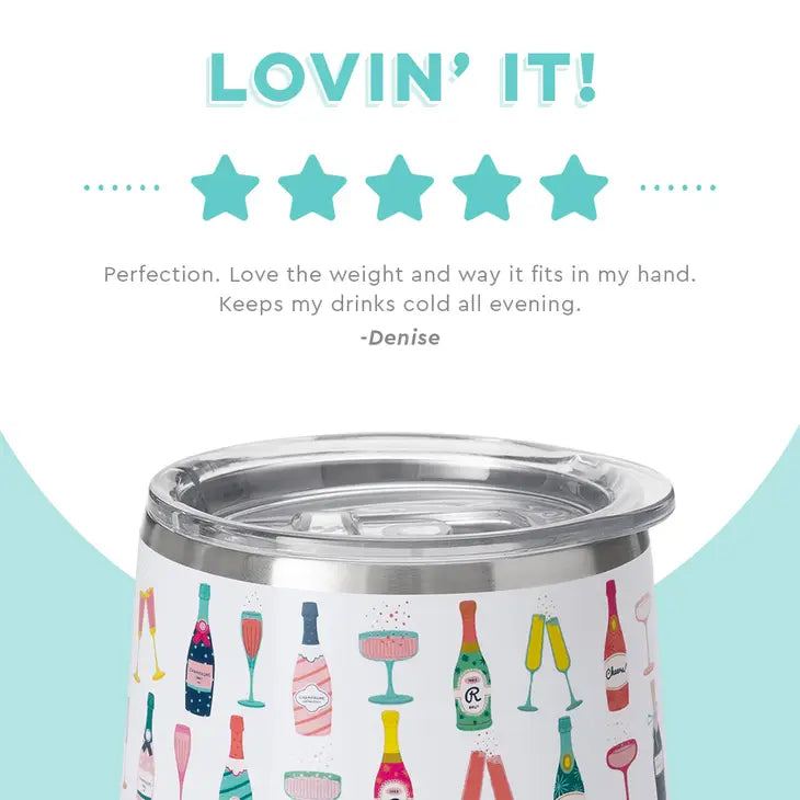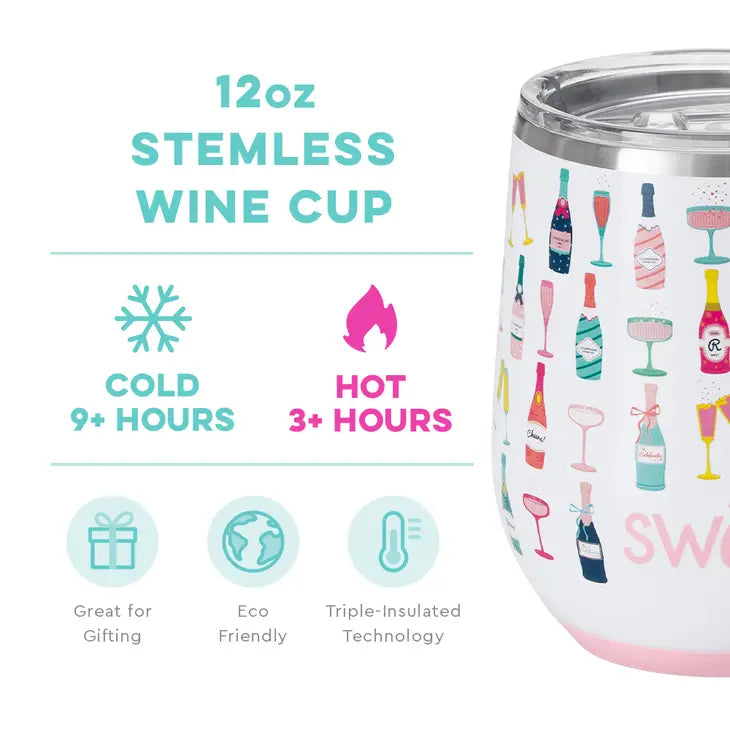 The Swig that started it all! Our original 12oz Stemless Wine Cup has all the same bells and whistles as her 14oz gal pals. Reds and whites can be sipped without worry! - Holds up to 12oz - Keeps drinks cold for 9+ hours and hot 3+ hours - Dishwasher safe, top rack only - Slip-free, scratch-free and noise-free silicone base - Includes BPA-free lid with removable slider for cleaning - Triple insulation technology: double-walled, vacuum-sealed and copper-plated - Condensation free and non-breakable - Constructed of 5mm 304-18/8 stainless steel - Measures 4.5" H x 3.25" W (lid included); base 2.7" in diameter; 0.4lb when empty