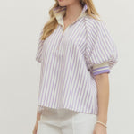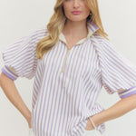 Striped short puff sleeve top featuring contrast ribbed collar and half-zip closure at front. Ribbed cuffs. Unlined. Woven. Non-sheer. Lightweight.