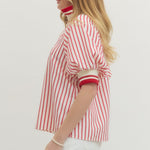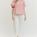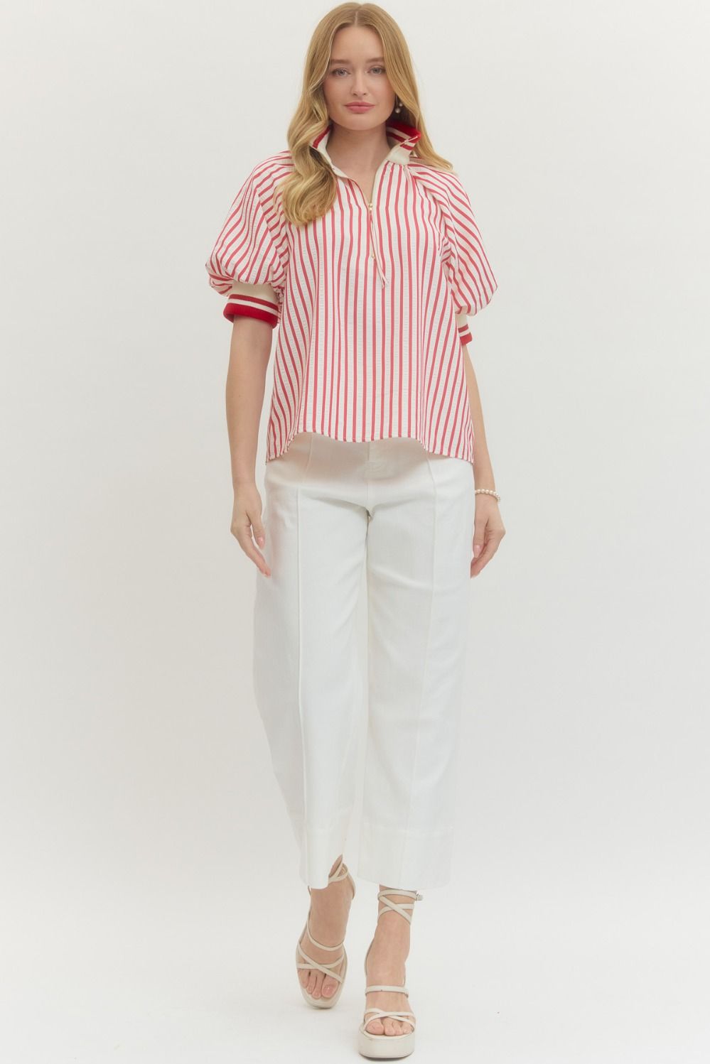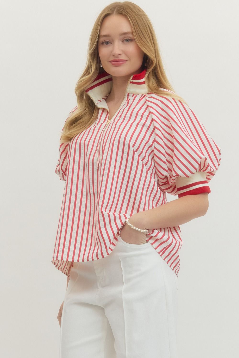 Striped short puff sleeve top featuring contrast ribbed collar and half-zip closure at front. Ribbed cuffs. Unlined. Woven. Non-sheer. Lightweight.