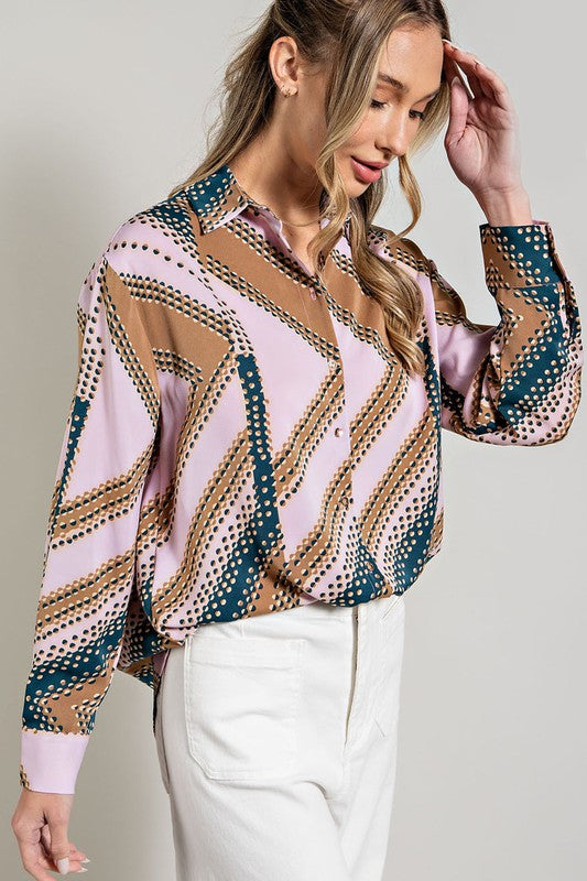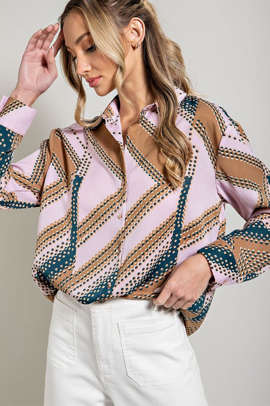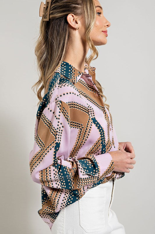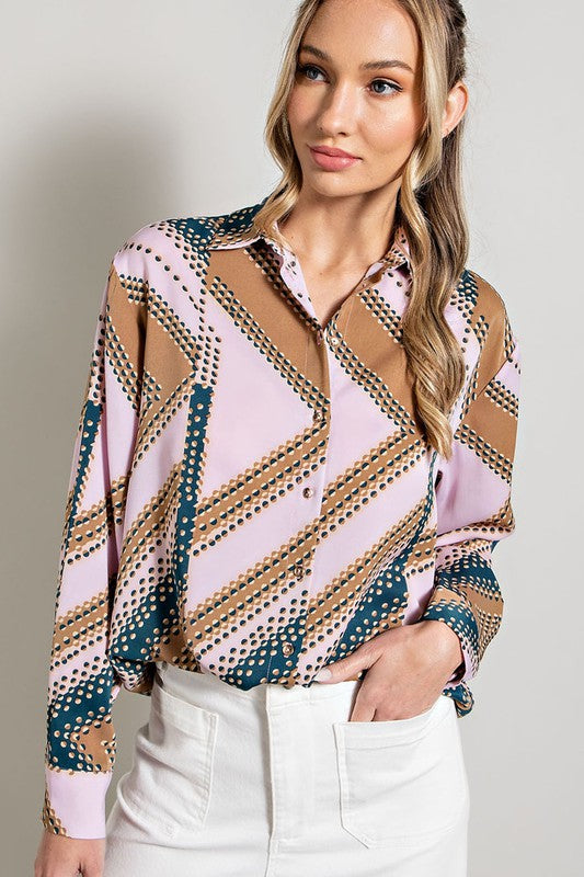 Geometric printed shirt featuring a button down front, an inverted pleat in the back for added detail, buttoned cuffs, and a collared neckline. Style with multiple different colors of jeans or pants.
