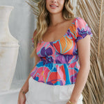 Multicolor abstract print peplum blouse -Round neckline -Short frilled balloon sleeves -Smocked waist
