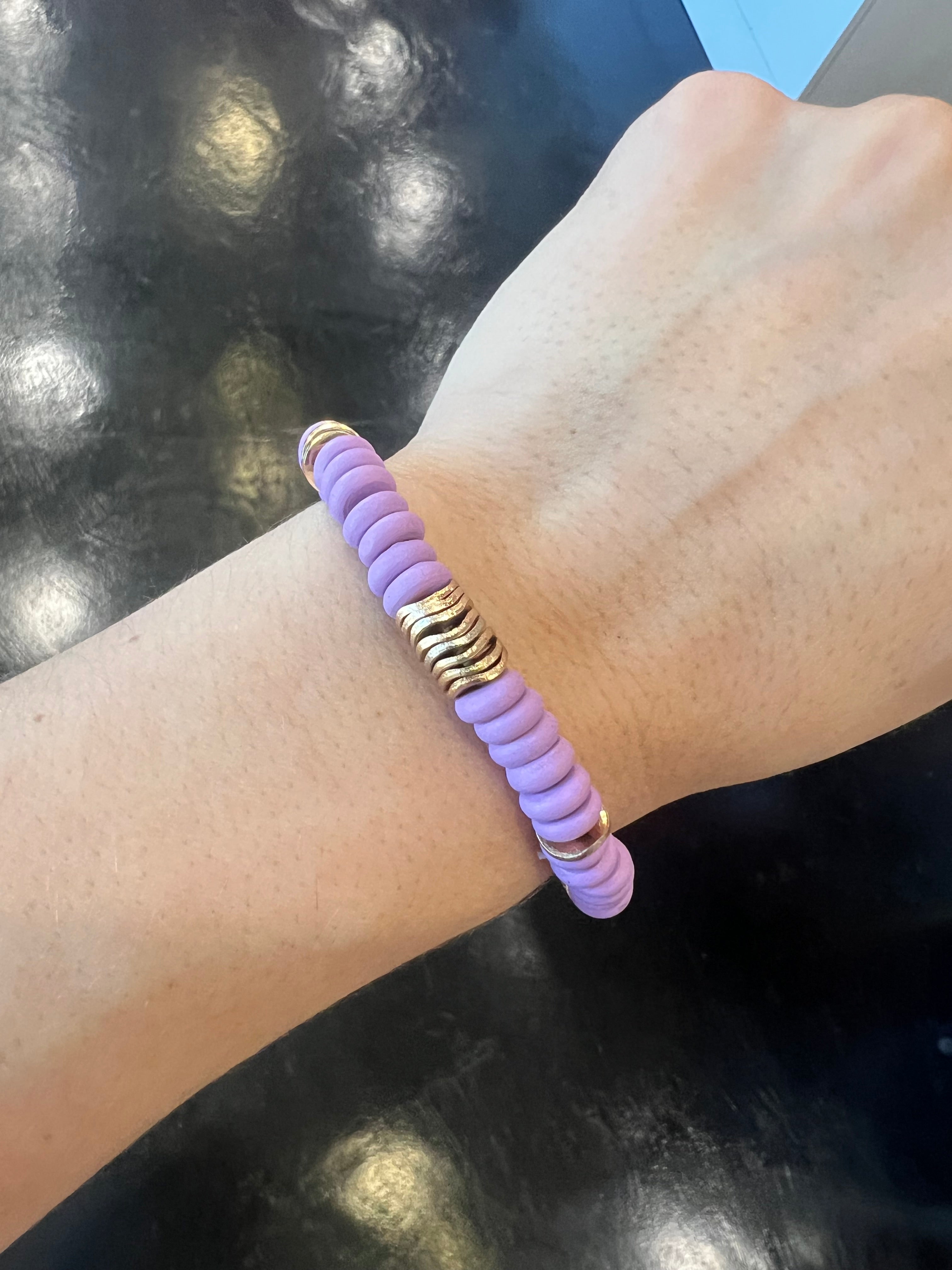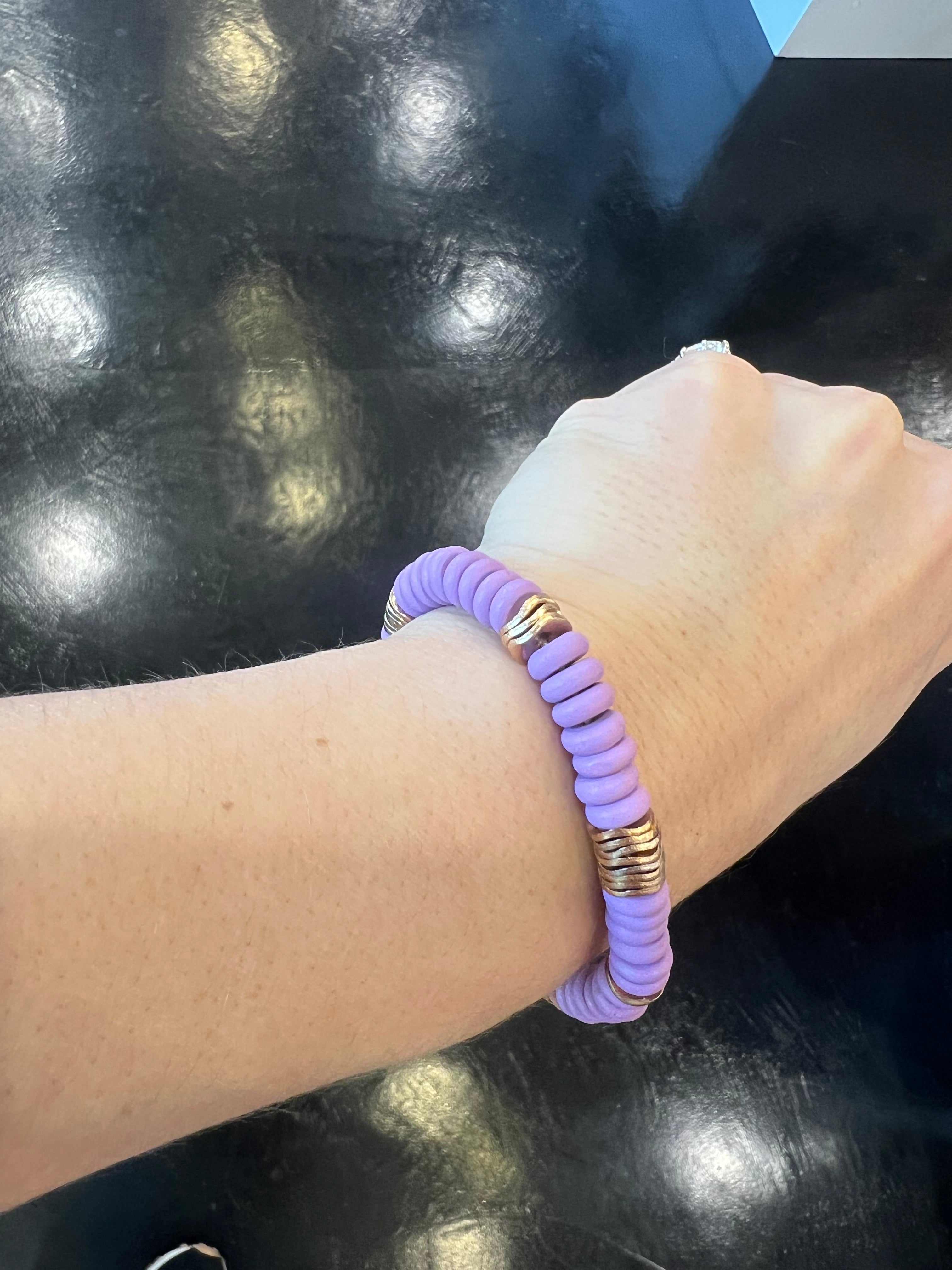 This purple disc bracelet features a captivating design with its prominent purple discs. interspersed among them are elegant gold disc accents adding a touch of sophistication and glamour.