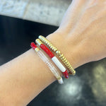 This spirited bracelet seamlessly blends the beauty of red, white and gold hues, creating a striking accessory perfect for any upcoming game days! Tube accents interspersed within the beads add a contemporary and dynamic flair to the design .