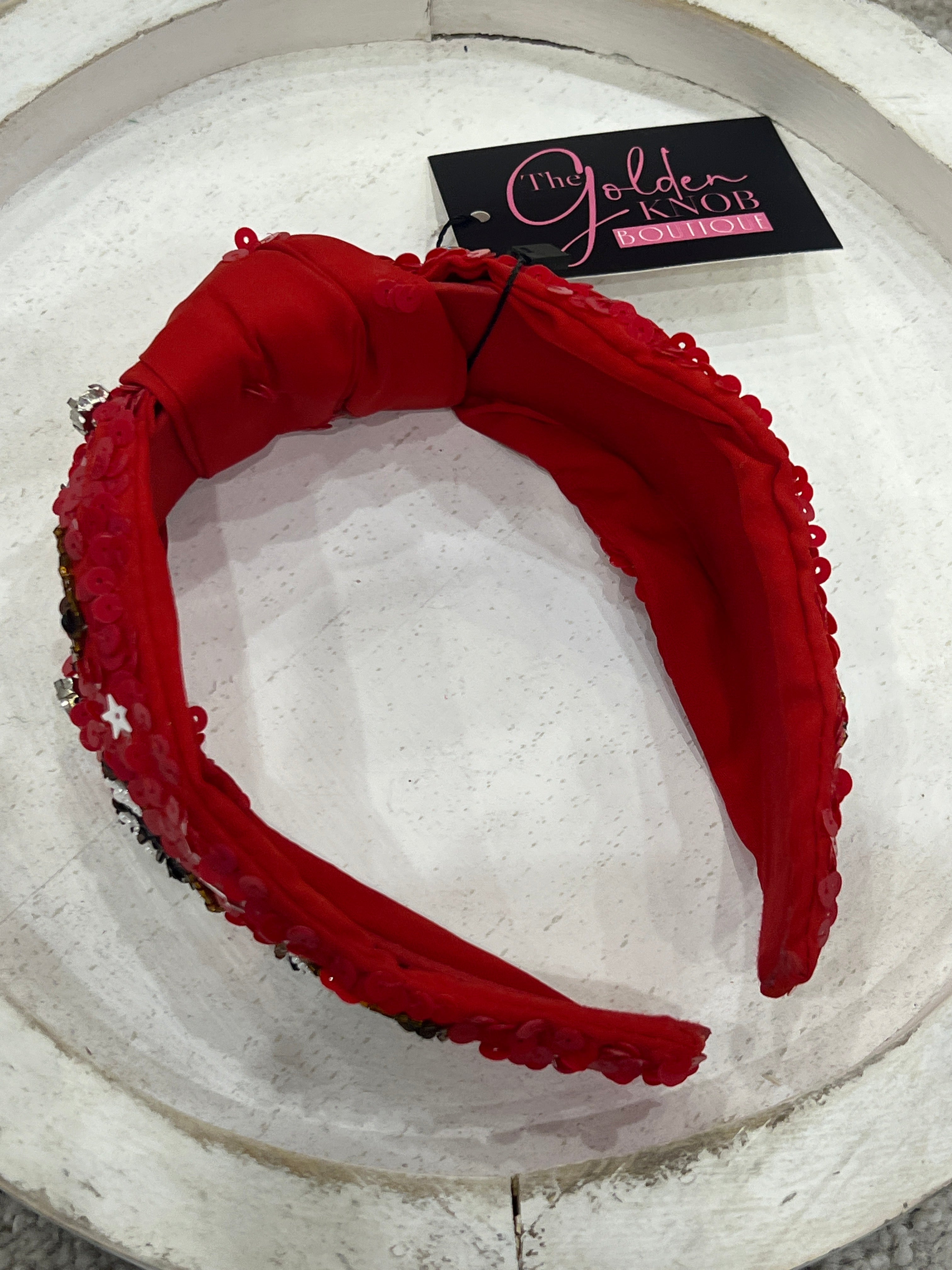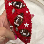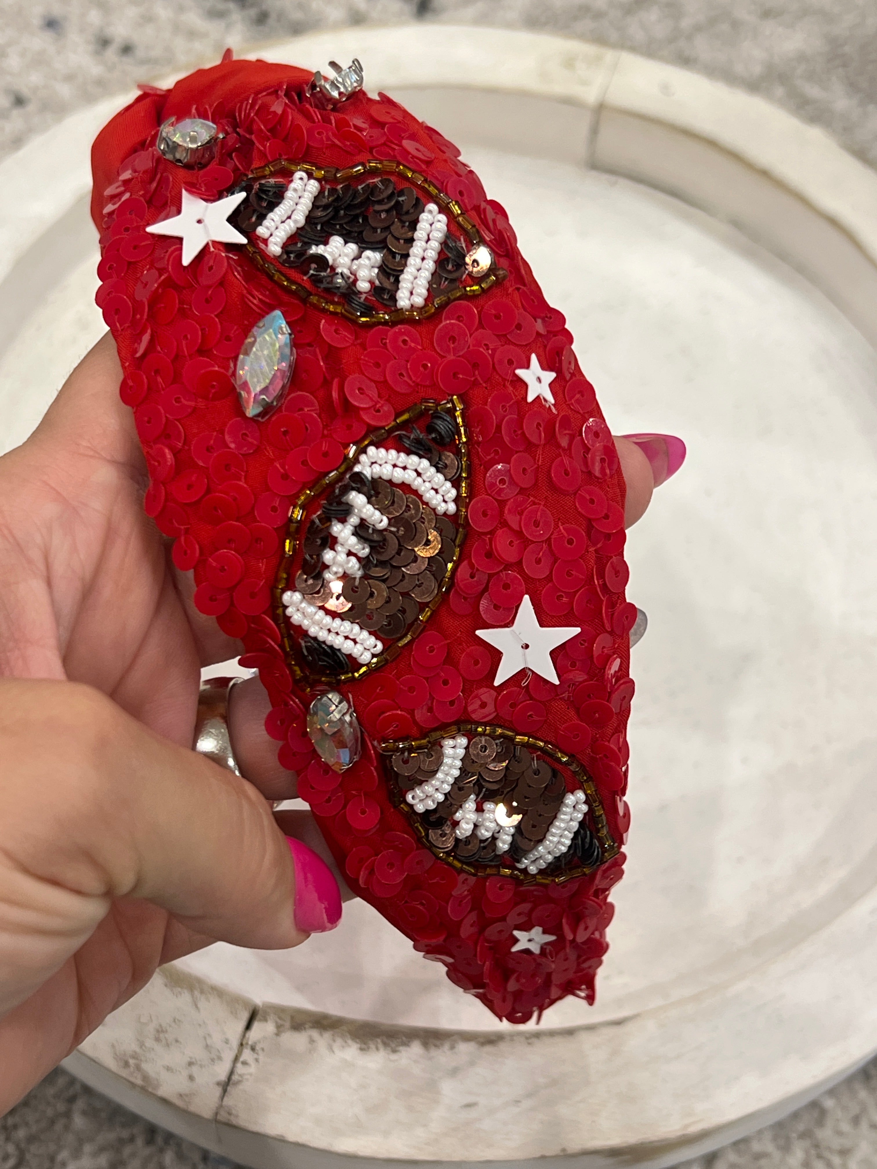 Covering the headband are shimmering red sequins, which catch the light with every movement. Interwoven among the sequins are iridescent rhinestones, which add a subtle yet enchanting shimmer to the headband. Amidst the sequins and rhinestones are charming football motifs, crafted from tiny beads. These footballs add a playful and sporty touch to the headband, Each football is meticulously crafted with attention to detail, capturing the essence of the sport in miniature form.