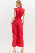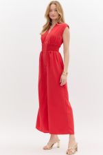 This solid V-neck sleeveless wide-leg jumpsuit is your new go-to for effortless style! The flattering V-neck and wide-leg cut give it a sleek, chic look, while the smocked waist ensures a comfy, fitted feel that still lets you move freely. With pockets at the sides (because who doesn’t love pockets?), this jumpsuit is as practical as it is cute. The lightweight, woven fabric is perfect for warmer days, and the lined design keeps everything looking smooth and non-sheer. Whether you're dressing it up for a night out or keeping it casual for a day of fun, this jumpsuit is all about easy, elevated style.