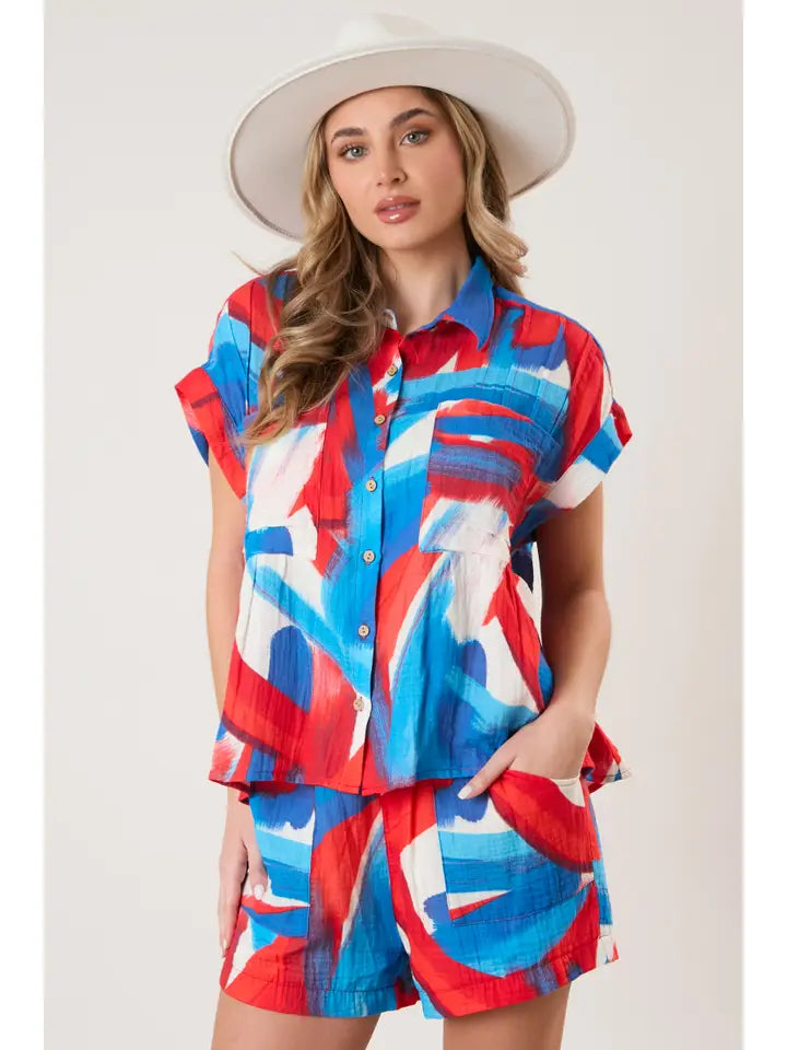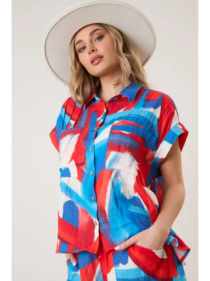 Go into fourth of July in style with our red, white and blue button-down shirt. This piece is crafted from lightweight and breathable 100% cotton gauze fabric, offering exceptional comfort and a soft feel against the skin. The fabric's airy nature makes it perfect for warm weather, ensuring you stay cool and comfortable throughout the day. The shirt features a classic collared neckline, which adds a touch of refinement to its casual design. The button-down closure allows for easy wear and adjustable ventilation based on your comfort level. Designed with short sleeves, this shirt is well-suited for summer days, providing a relaxed and laid-back silhouette. The short sleeves enhance its versatility, allowing it to be worn alone or layered under a lightweight jacket or sweater for cooler evenings.