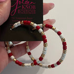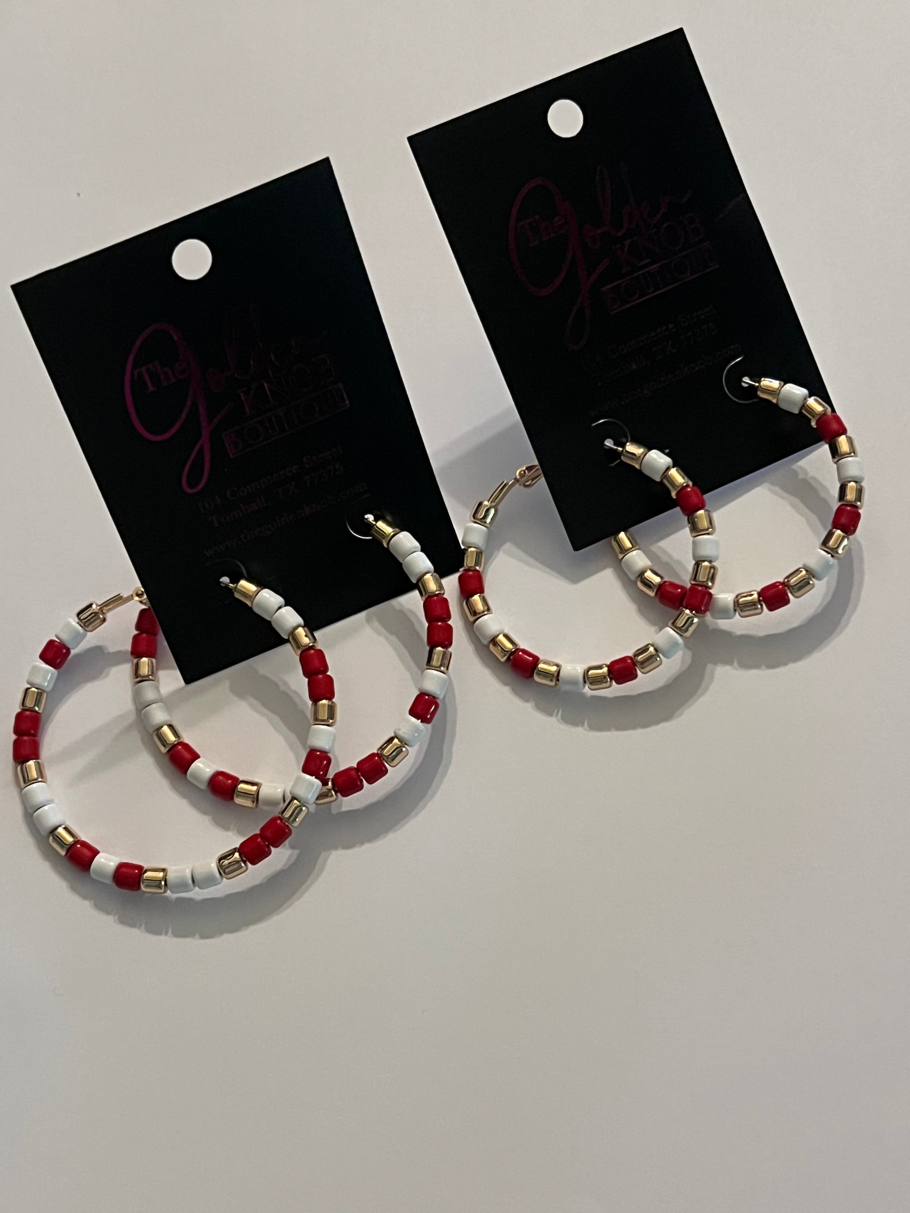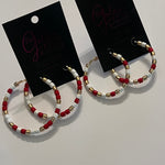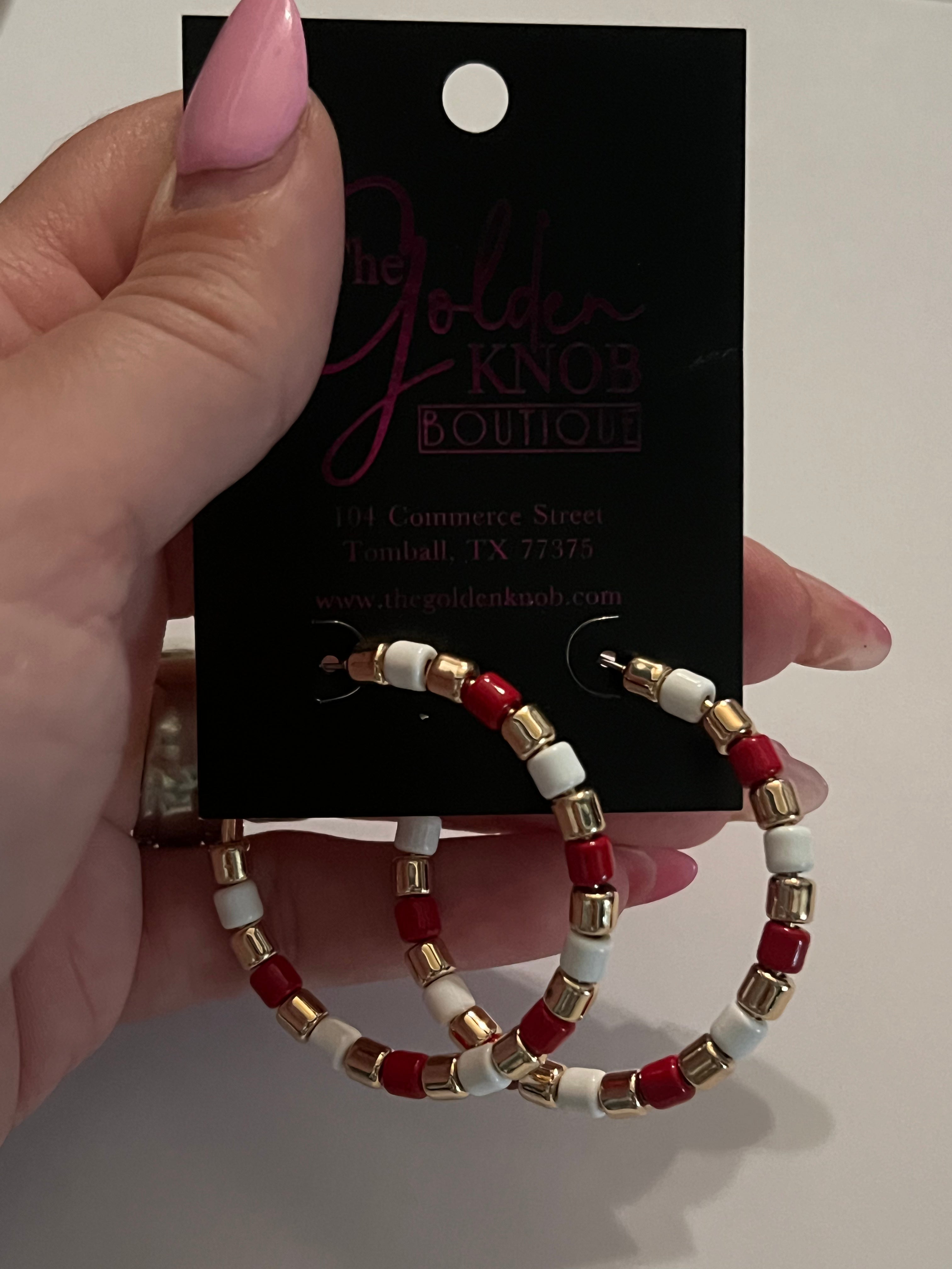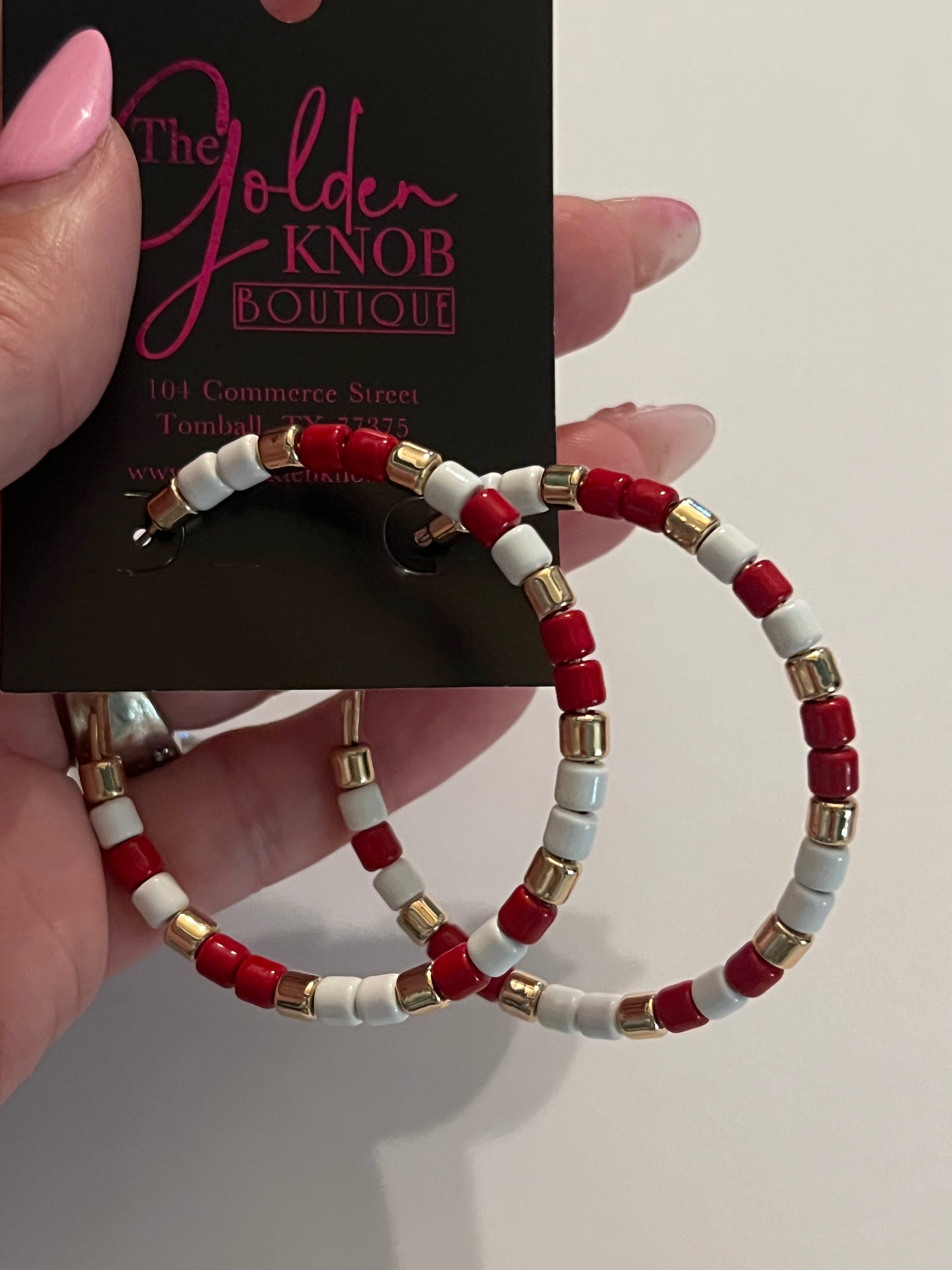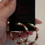 Elevate your look with a pop of gameday glam! These Red, White, and Gold Beaded Hoops are the perfect blend of bold and beautiful, featuring vibrant beads in a timeless color combo that shines with every turn.