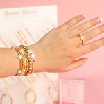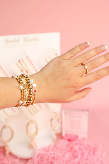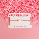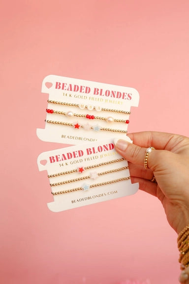 The triple star bracelet! Perfect for Memorial Day or 4th of July. A custom-made bead with festive combination of red, white, and blue. Material: 14 K gold filled beads and durable elastic string. Handstrung with love in College Station, Texas.