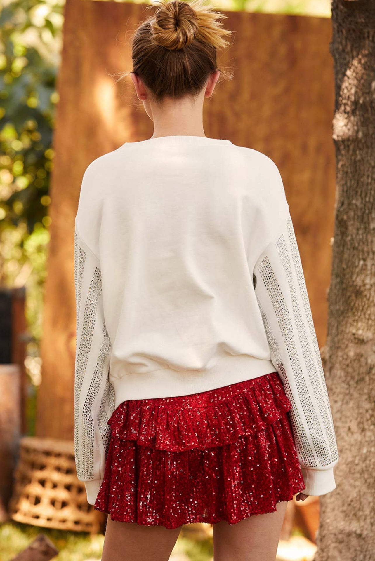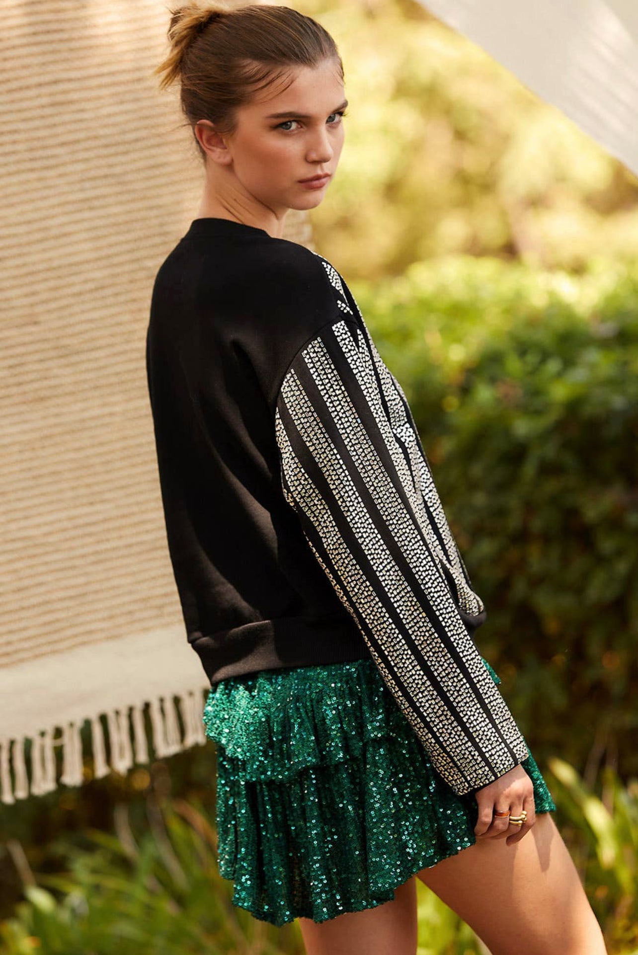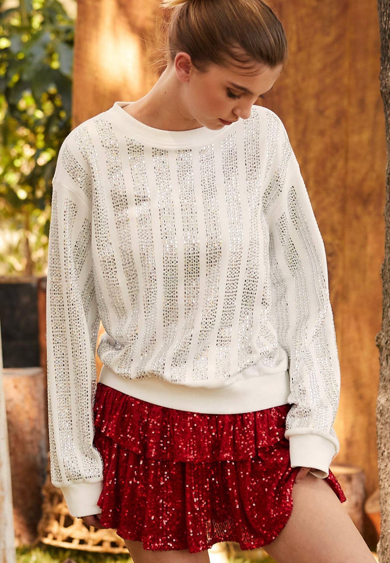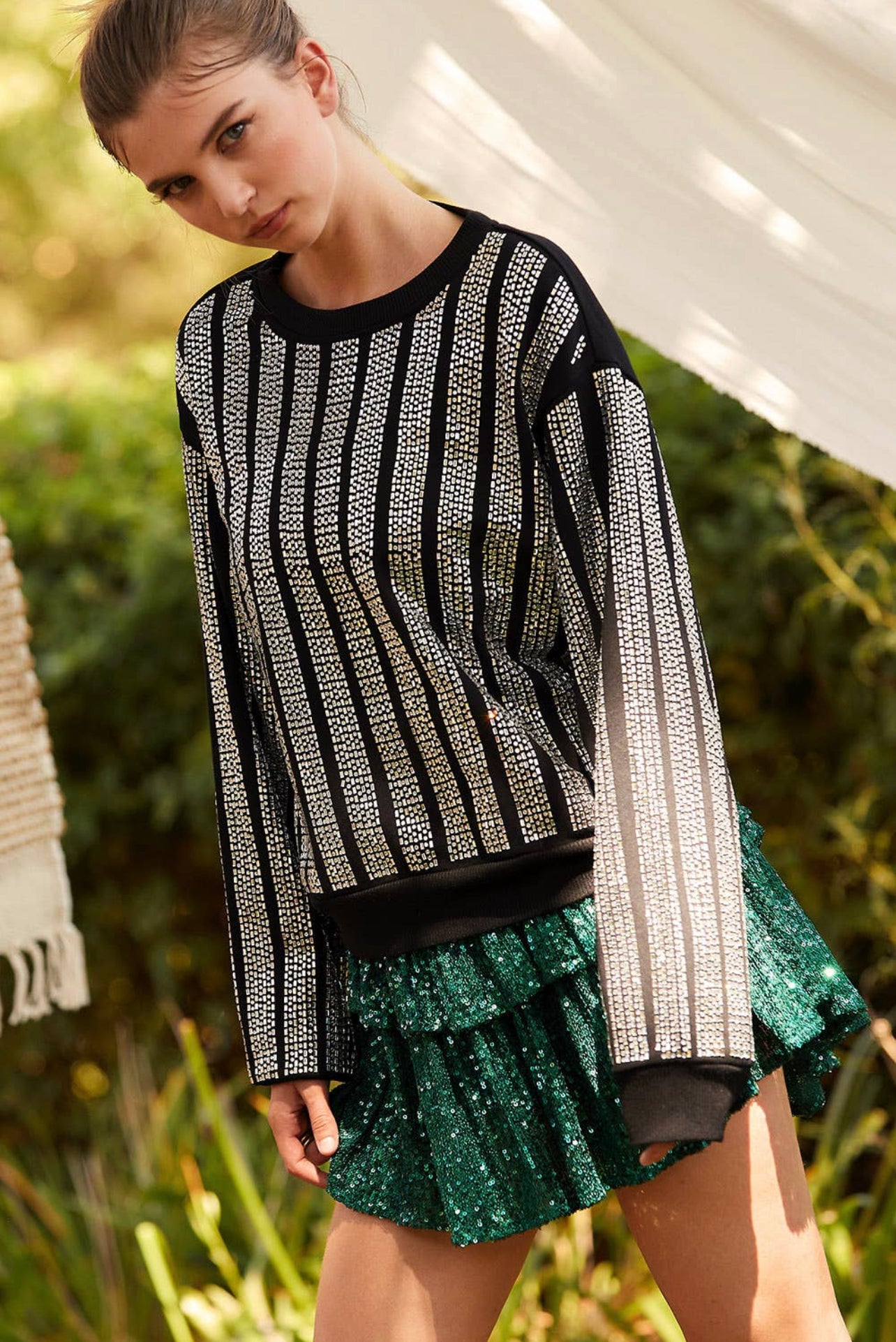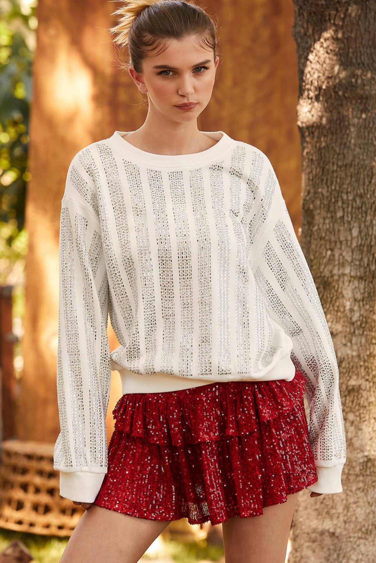 Rhinestone Stripe Round Neck Terry Top 60% COTTON 40% POLY