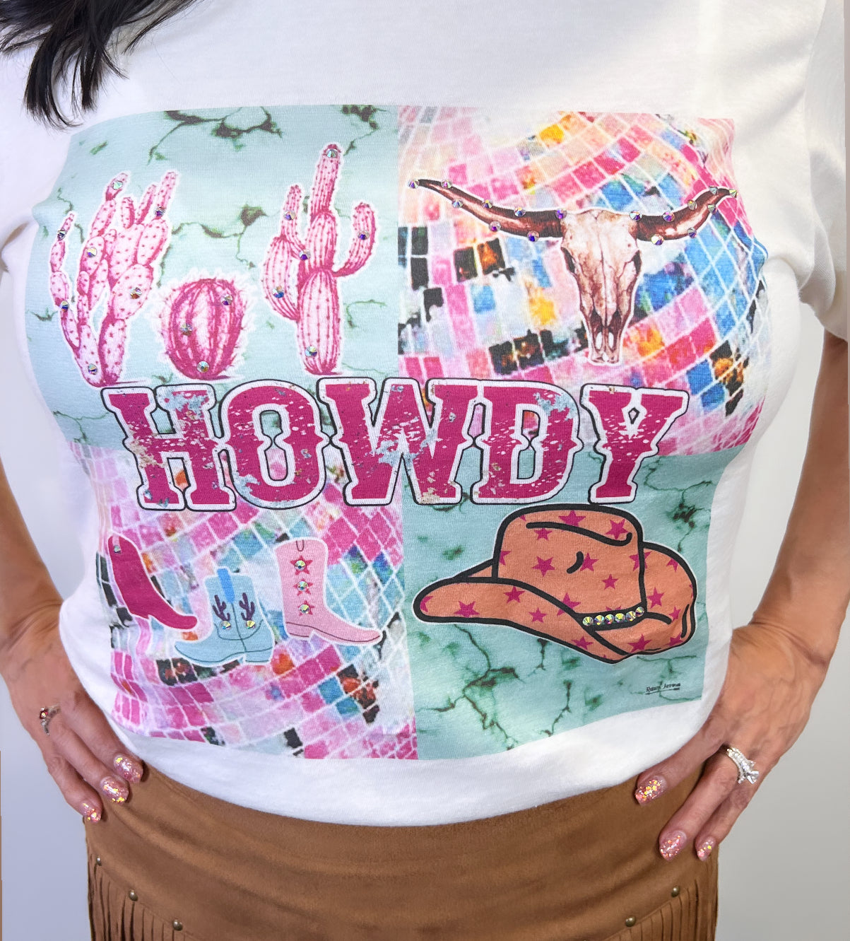 This Howdy Tee shirt has the perfect amount comfort and sparkle to live your rhinestone cowgirl dreams! This tee fits true to size!