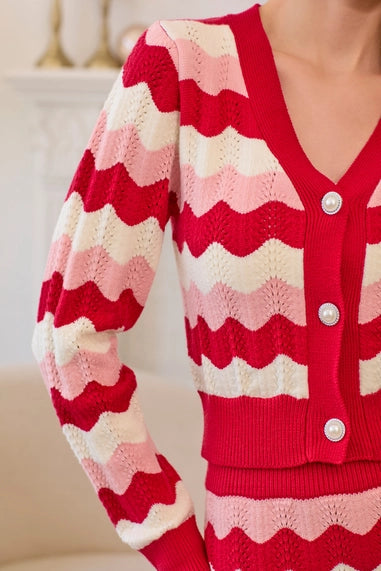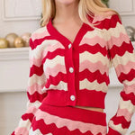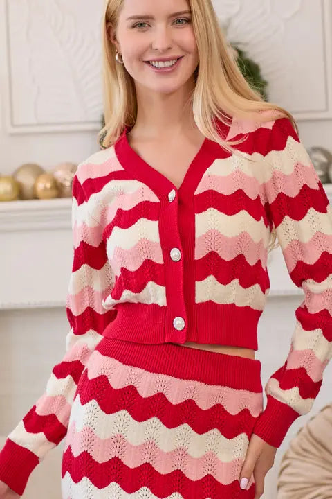 This Ric Rac Stripe Sweater Knit Cropped Cardigan and Midi Skirt Set in red, white, and pink is the ultimate mix of cozy, cute, and stylish. The cropped cardigan features playful ric rac stripes in bold red, soft pink, and crisp white, giving it a fun, retro feel. Paired with the matching midi skirt, this set creates a flattering, feminine look that’s perfect for a day out or a casual gathering. The soft sweater-knit fabric keeps you comfy, while the midi length of the skirt adds a touch of elegance. It’s a perfect balance of cozy and chic—easy to dress up or down!