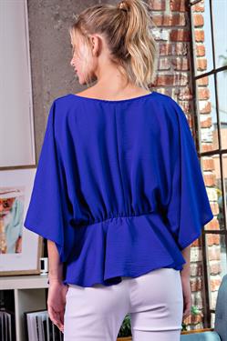 Blouse top featuring short dolman sleeves, v-neckline, and cinched waist.