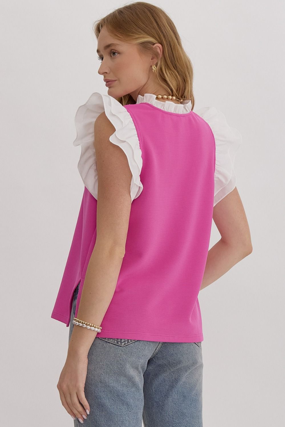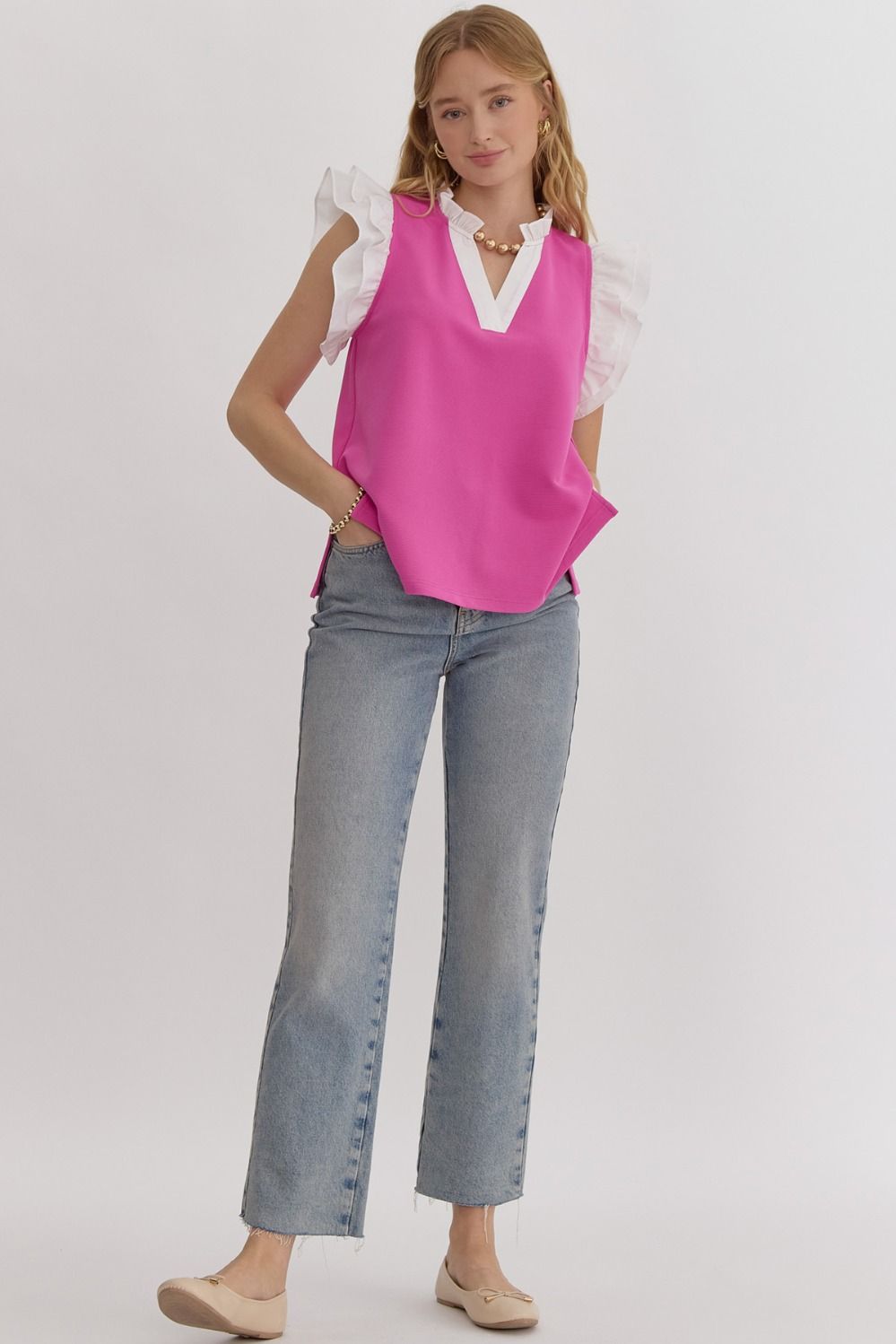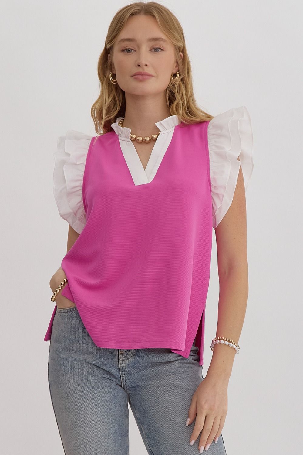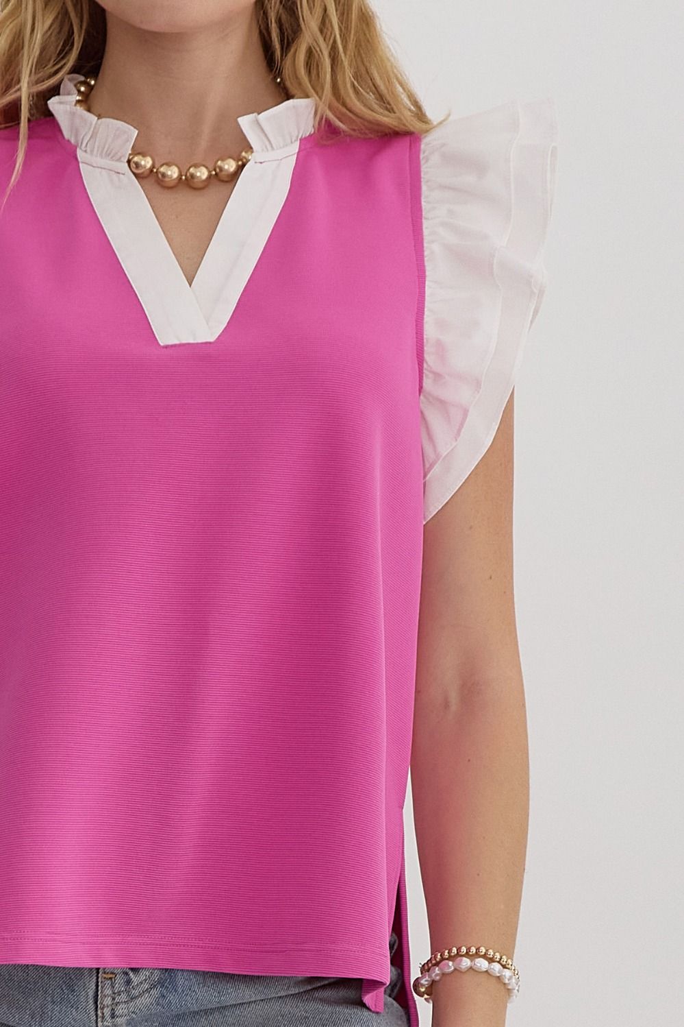 This textured solid v-neck sleeveless top offers a perfect blend of sophistication and comfort. The v-neckline adds a touch of elegance, while the sleeveless design is ideal for warmer days. The standout feature of this top is the ruffle detail at the shoulders, which adds a feminine and playful touch, elevating the overall look.