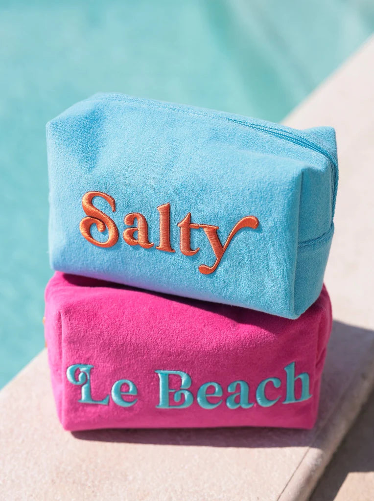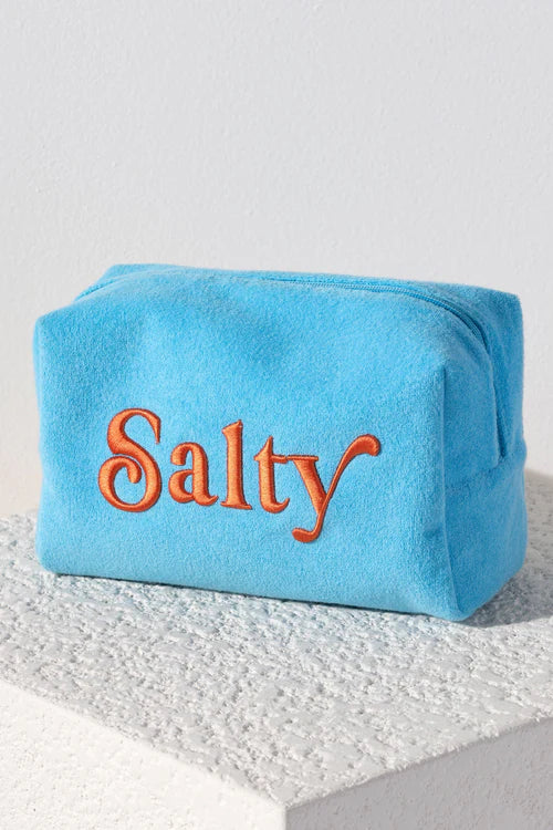 Carry all your odds and ends in style with this "Salty" Zip Pouch. Made from soft and absorbent cotton terry with a PVC inner lining, this pouch is a perfect companion for the poolside or on the go. Its trendy embroidery of the word "Salty" makes it a fun addition to your summer wardrobe.