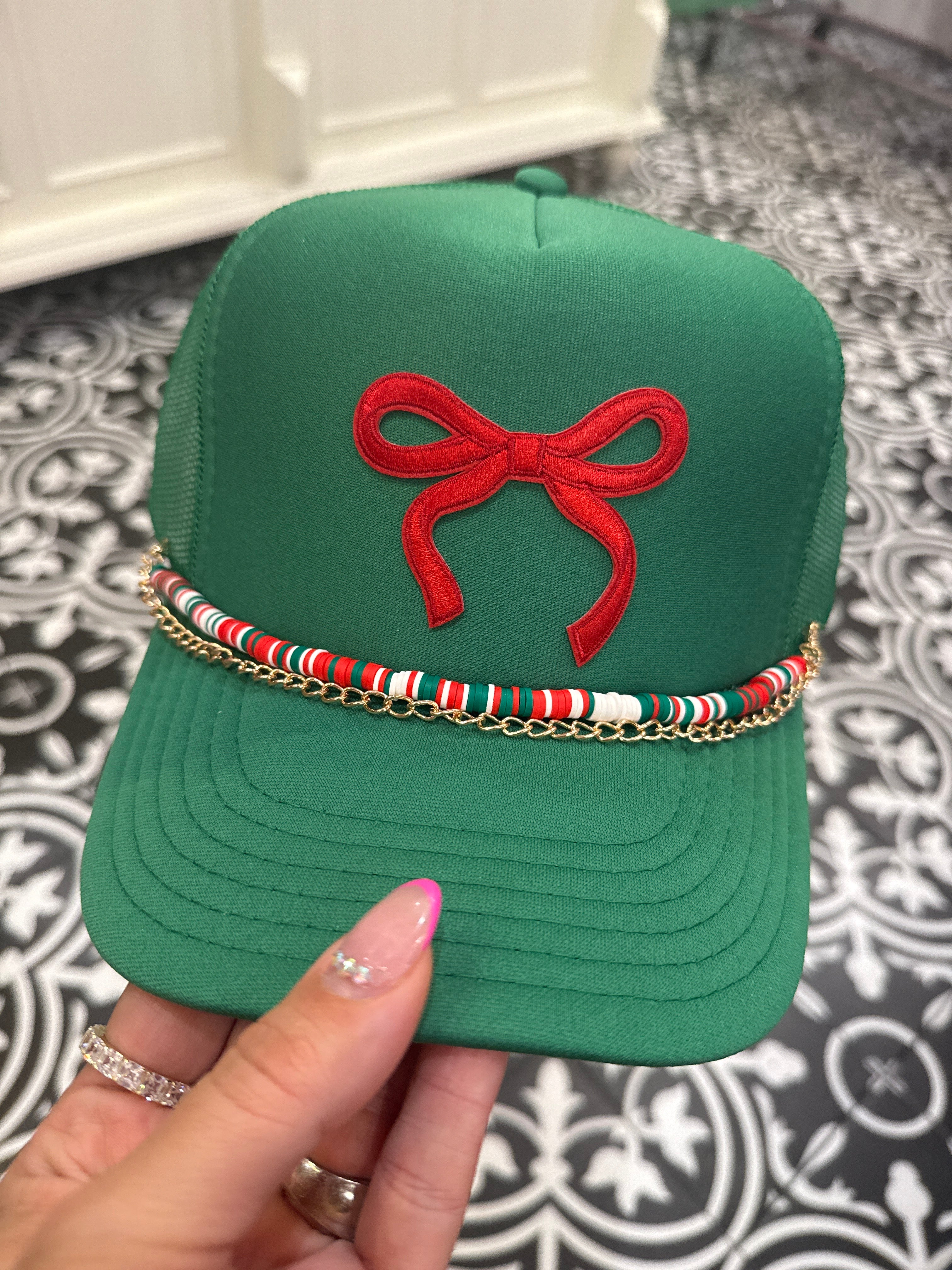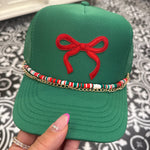 Add a little sass to your style with our Green trucker hat with a red bow! Featuring a red bow patch on a green hat.  This hat is the perfect mix of festive and fun. Whether you’re running errands, heading to party, or just spreading some cheer, this cap is sure to be your go-to accessory all season long.