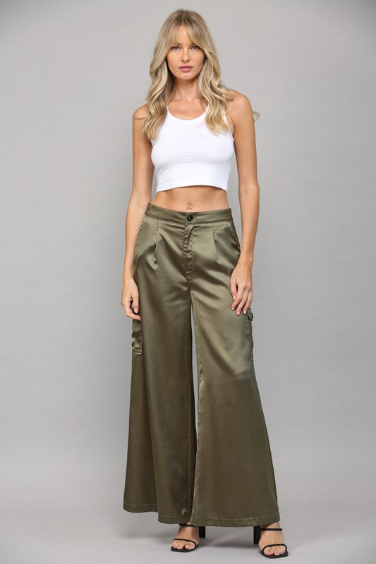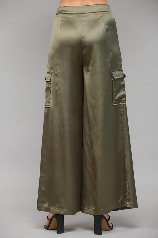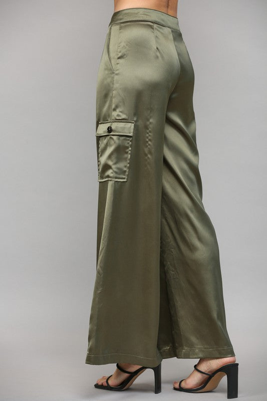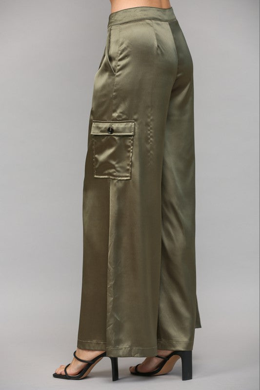100% polyester satin cargo pants in olive