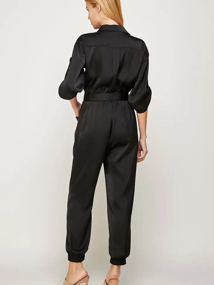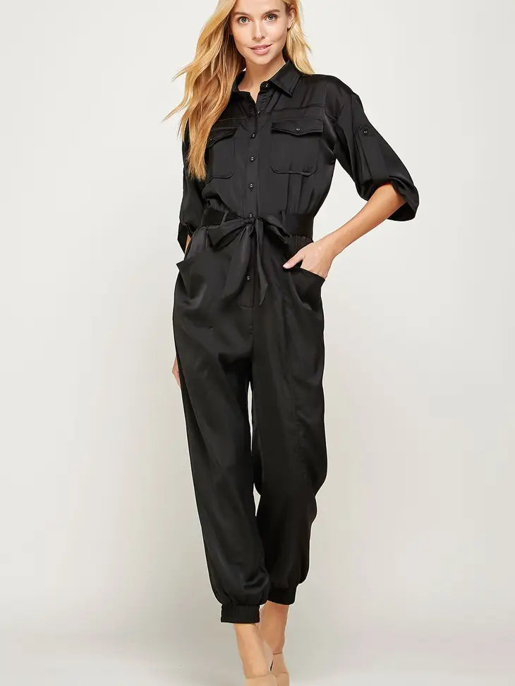 Button up shirt utilitarian jumpsuit in satin fabric. This style features button up closure at front, shirt collar, removable sash tie at waist, tapered legs with elasticated hem,
