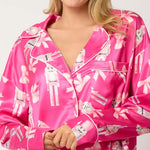 Get ready for cozy nights in with this Satin Nutcrackers & Bow Prints Pajama Set! Featuring a charming nutcracker and bow design, this set adds a playful touch to your sleepwear collection. The collared top with long sleeves and a chest pocket is both stylish and comfy, perfect for lounging around the house. The contrast ruffle detailing along the hem and seams brings a sweet, feminine flair. With an elastic waistband and side pockets, you’ll feel relaxed and ready for anything, whether you’re sipping hot cocoa or snuggling up with a good book. This pajama set is all about comfort and a bit of festive fun!