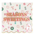 These playful holiday napkins are sugar-coated perfection! Featuring the phrase “Seasons Sweetings” in bold pink and red lettering, they’re sprinkled with festive treats like candy canes, gumdrops, peppermints, and wreaths. With a scalloped gold edge and colorful pattern, they’re perfect for cookie exchanges, dessert tables, or adding a whimsical touch to any holiday gathering. Size- 6.5"; pack of 20