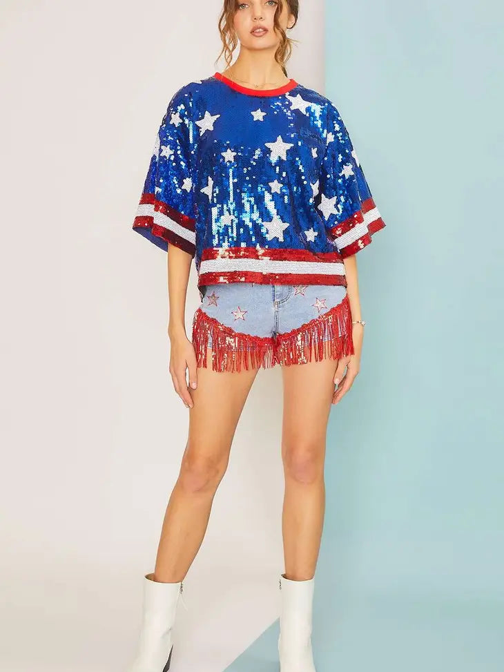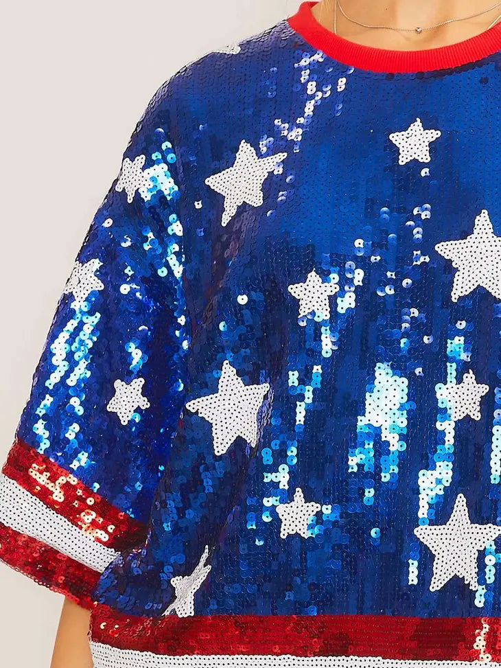 Round neck star print sequin short sleeve 4th of july theme crop top 100% poly