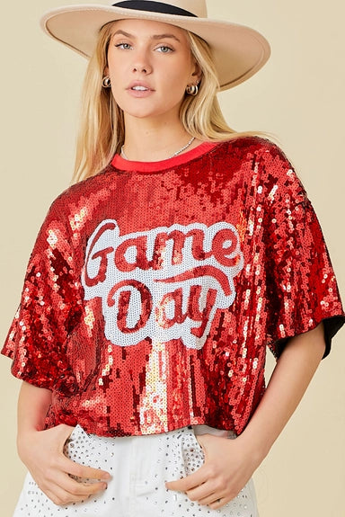 This vibrant red sequin top that sparkles with every movement. Across the chest, in bold and energetic white sequin letters, it spells out "Game Day" with a sense of excitement and anticipation. The sequins catch the light, making the letters stand out prominently against the fiery red background. It's a piece that exudes team spirit and energy, perfect for cheering on your favorite team or adding a touch of dazzle to any game day outfit.