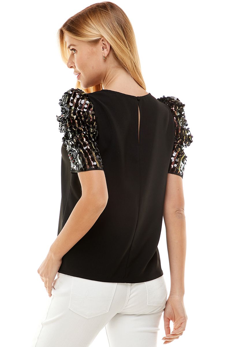 Loose fitting blouse with a round neckline and puff sleeves with sequin detailing. Button closure on back. Model Size + Fit: Model height: 5'9" Dress size: 2 Bust: 33 Waist: 25 Hips: 34 Fabric content: 100% Polyester