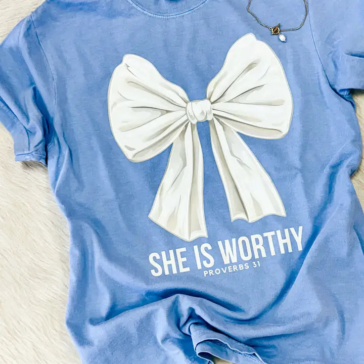 Embrace strength and grace with the "She is Worthy" Proverbs 31 Tee in Baby Blue. Featuring a timeless message inspired by Proverbs 31, this tee combines comfort and faith, making it the perfect addition to your everyday wardrobe. With its soft fabric and uplifting design, it’s a beautiful reminder of worth and purpose.