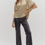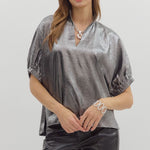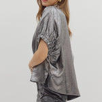 Step into the spotlight with the Shimmer & Shine Blouse, your new go-to for instant glam. Designed in a luxe crinkle-finish fabric, this blouse gives you that perfect touch of shimmer without being over the top. The relaxed silhouette and gathered sleeves keep it effortlessly chic, while the metallic finish in silver or gold makes it party-ready.