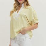 Striped short dolman sleeve top featuring contrast V-neck panel detail. Unlined. Woven. Non-sheer. Lightweight.