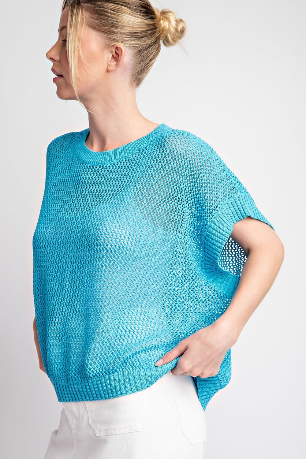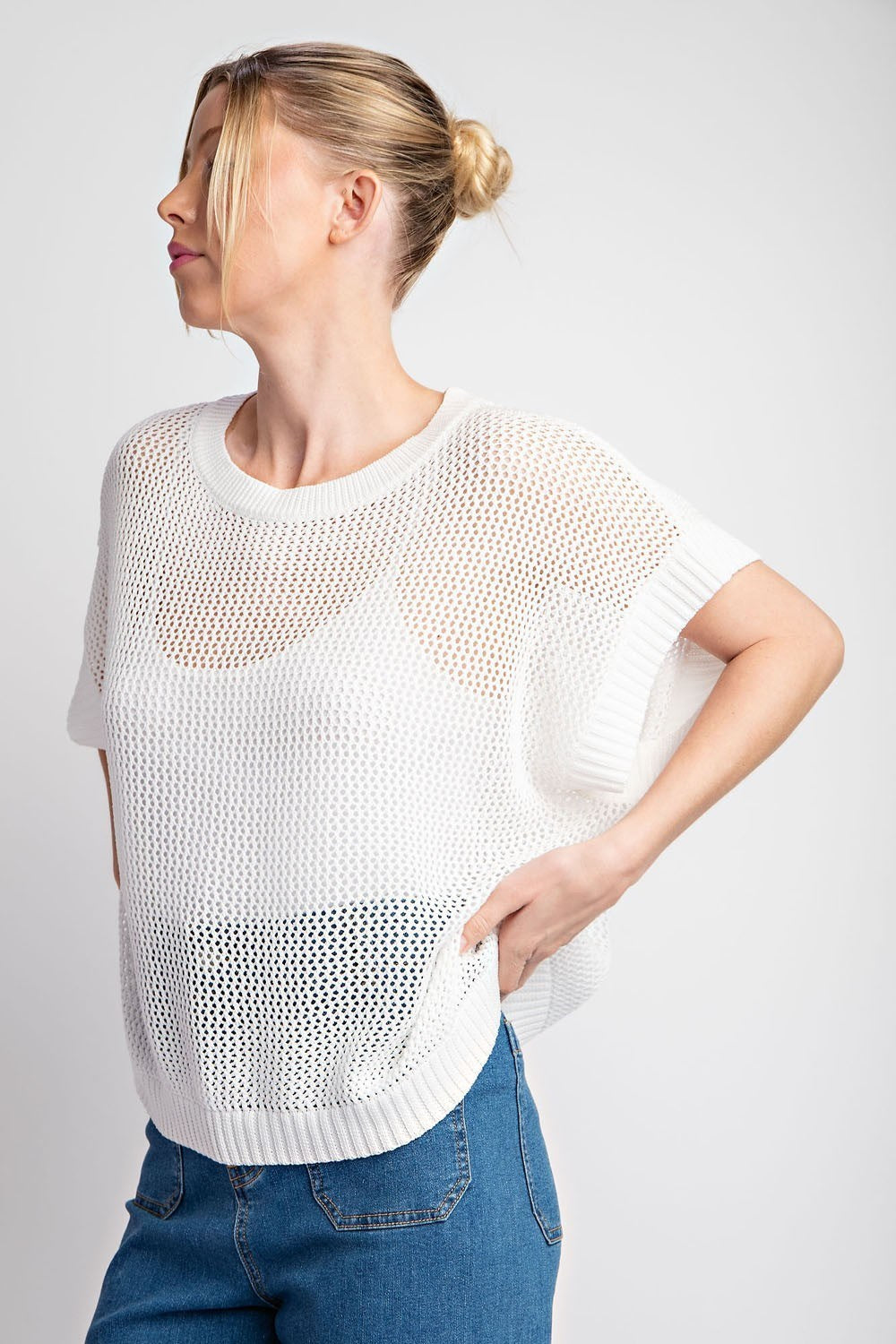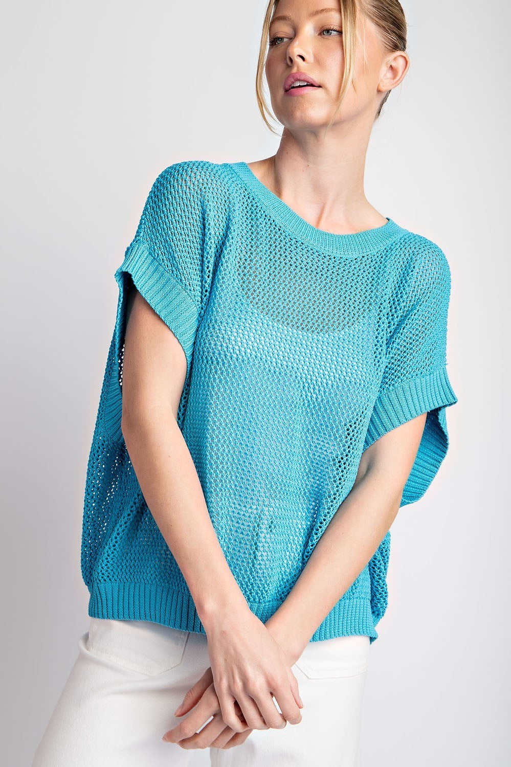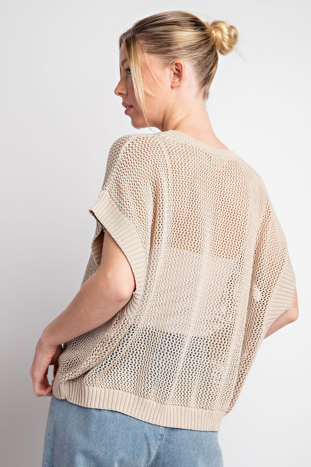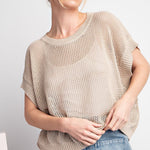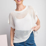 This short sleeve knit sweater top is perfect for the warmer weather headed our way! This piece features a rounded neckline, ribbed cuffs, a ribbed bottom band and a lightweight fabric is used to ensure a comfortable fit.
