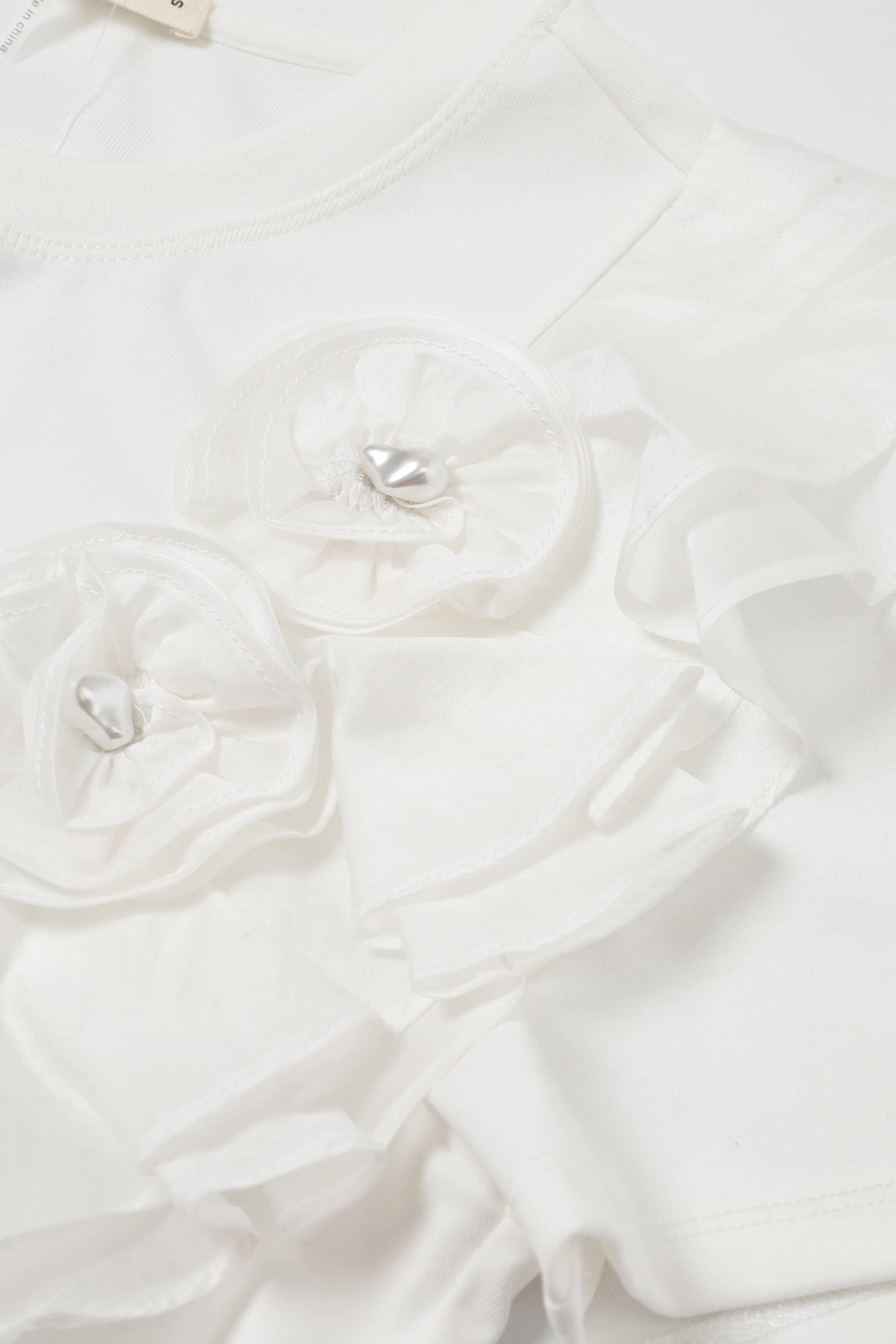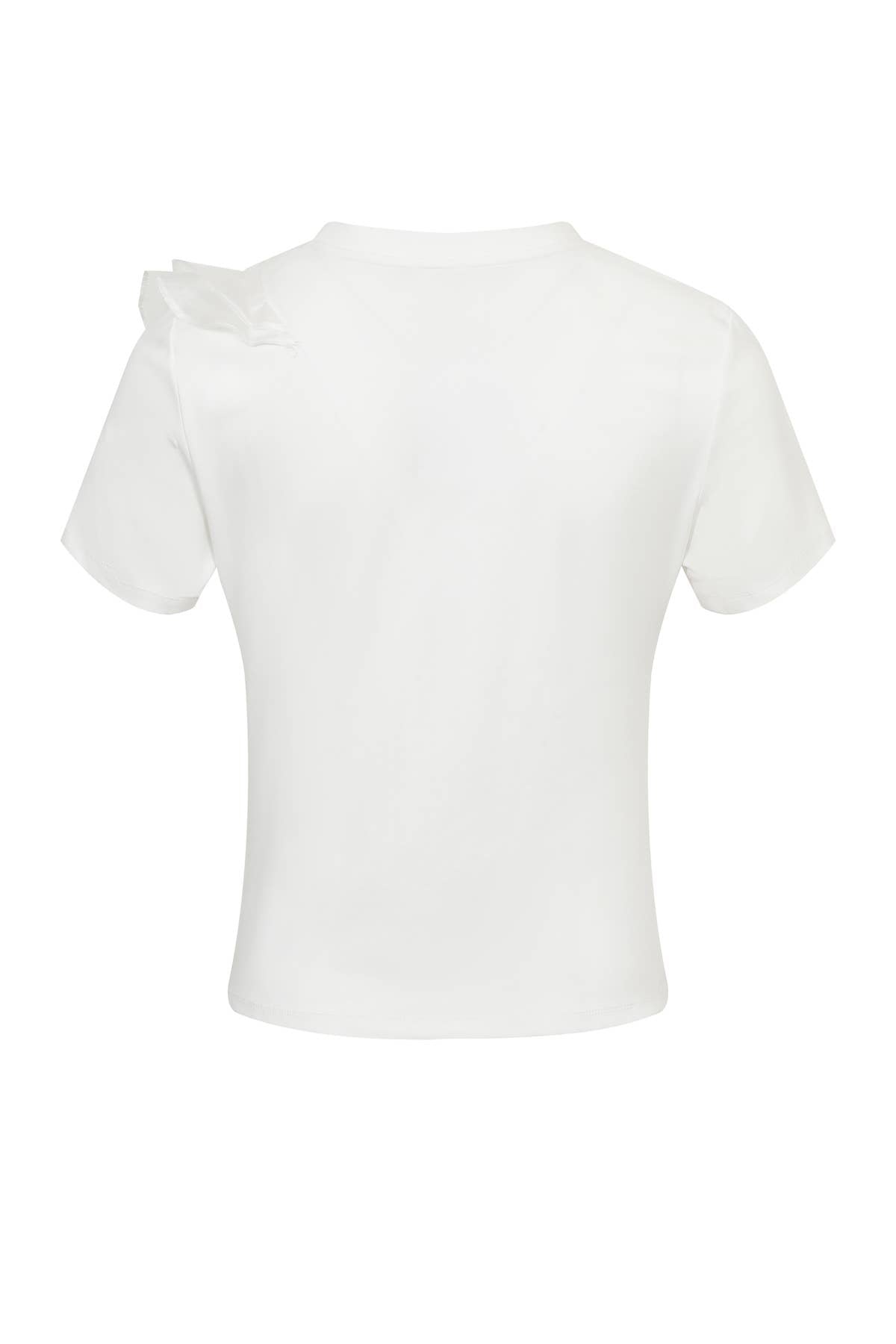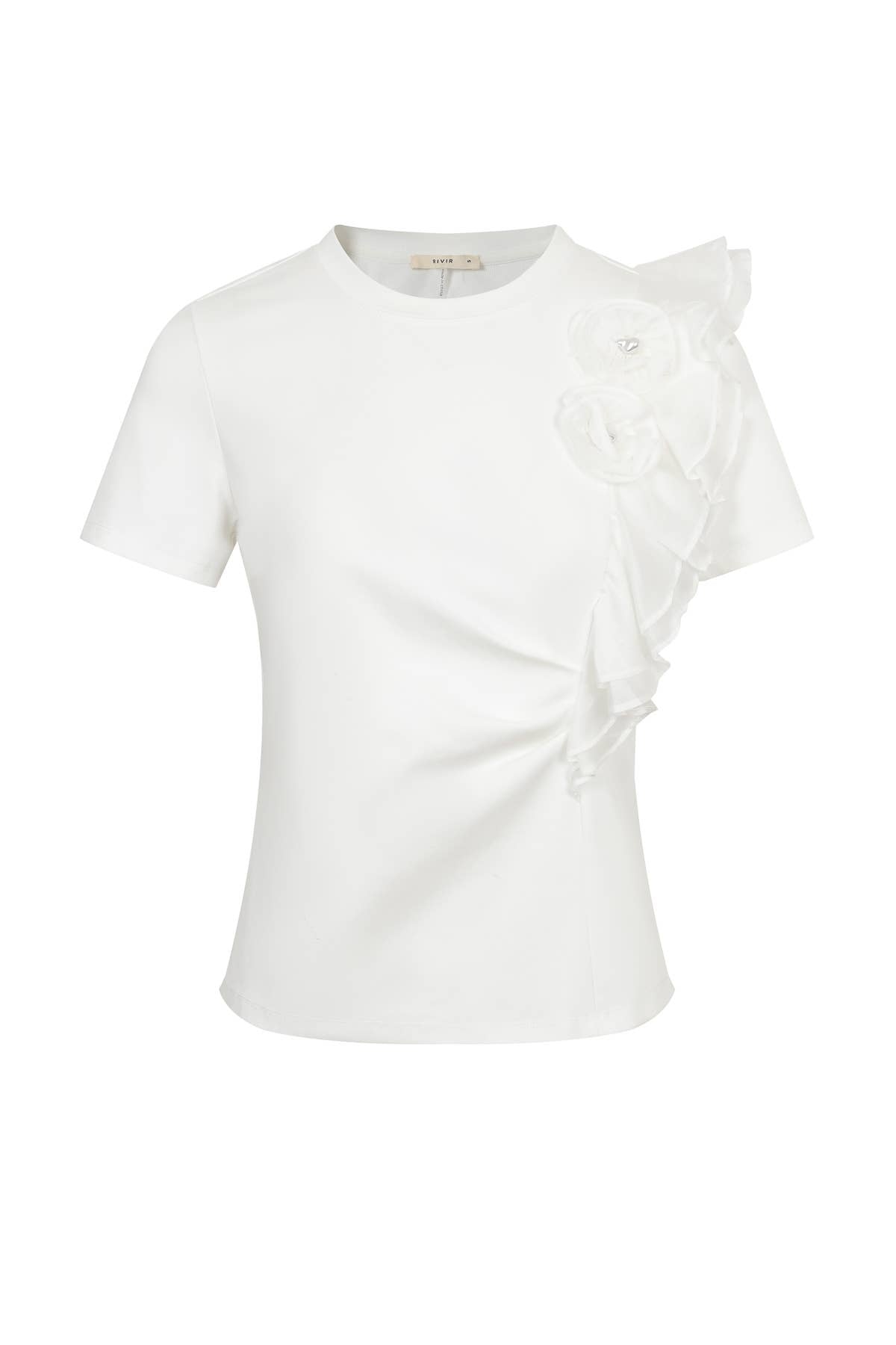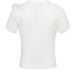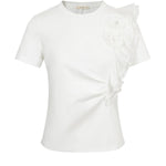 Short Sleeve Knit Top with Flower Detail 82% Cotton 18% Nylon Combo 1: 85% Tencel 15% Polyester Combo 2: 92% Cotton 8% Spandex