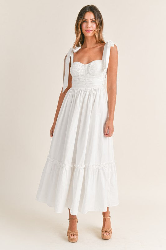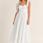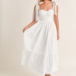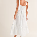 This dress is a perfect blend of comfort and style. The solid cotton poplin fabric gives it a crisp, fresh feel, while the ruched bust with light built-in cups adds a touch of flattering structure. The tiered midi length gives it a breezy, feminine vibe, and the self-tie shoulder straps allow for an adjustable, customizable fit. The back smocking ensures the dress hugs your shape nicely, and the exposed zipper detail at the back adds a modern, edgy touch. Ideal for casual days or dressy occasions, this dress offers effortless charm and comfort!