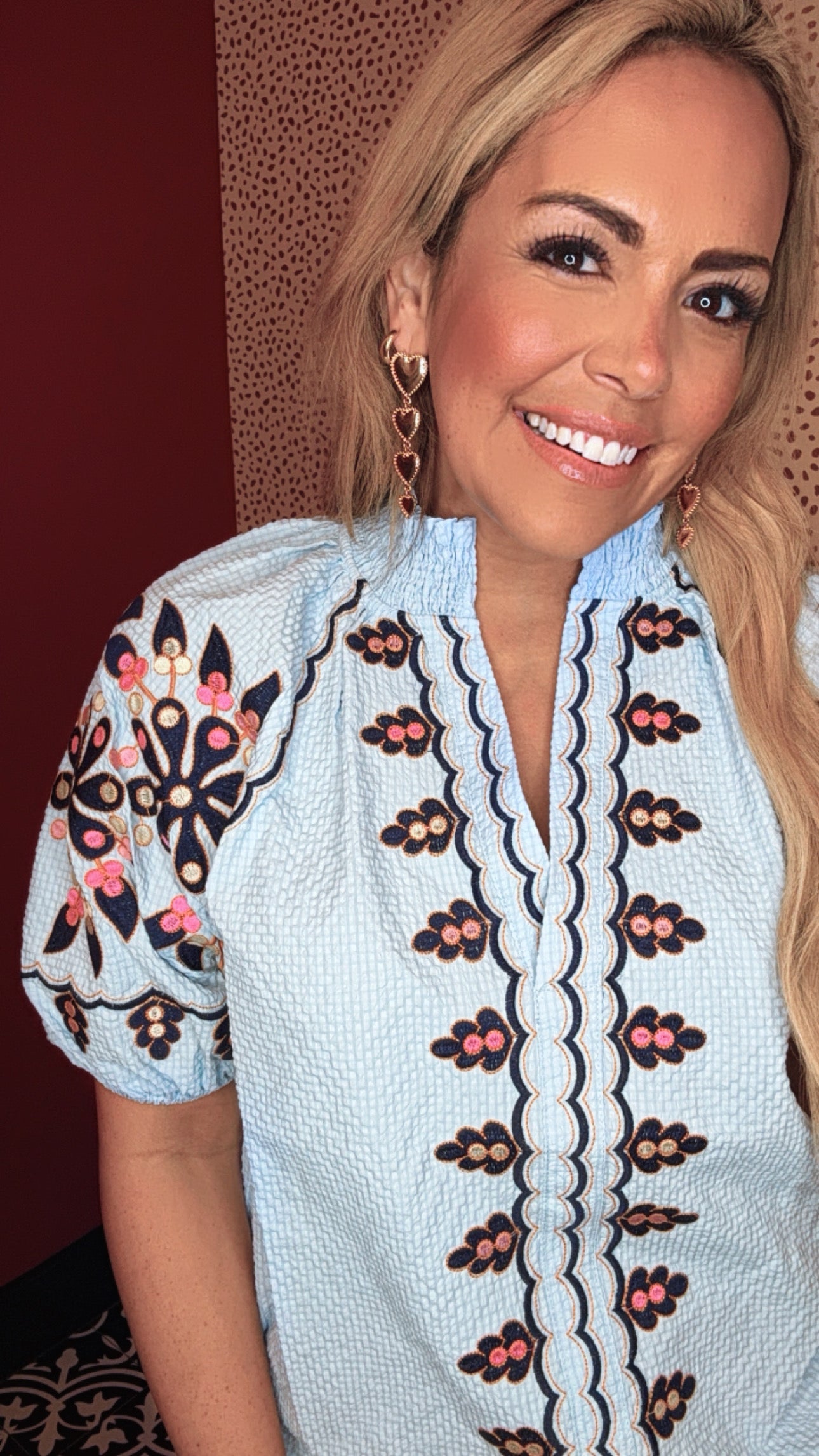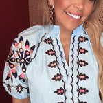 Fresh, feminine, and effortlessly chic — our Sky Blossom Embroidered Top is your new go-to for sunny days and casual gatherings. This lightweight textured top features a soft baby blue backdrop adorned with intricate floral embroidery in shades of navy, pink, and gold. The puff sleeves and scalloped detailing along the neckline add a touch of vintage charm, while the relaxed fit keeps it comfortable and flattering for all-day wear.