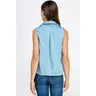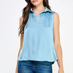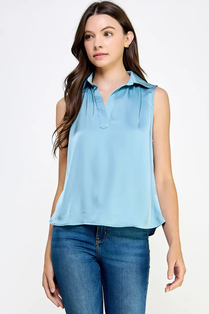 Sleeveless blouse in satin fabric. Relaxed and classic, this sleeveless blouse features a spread collar with an open v neck line and ruched back detailing.