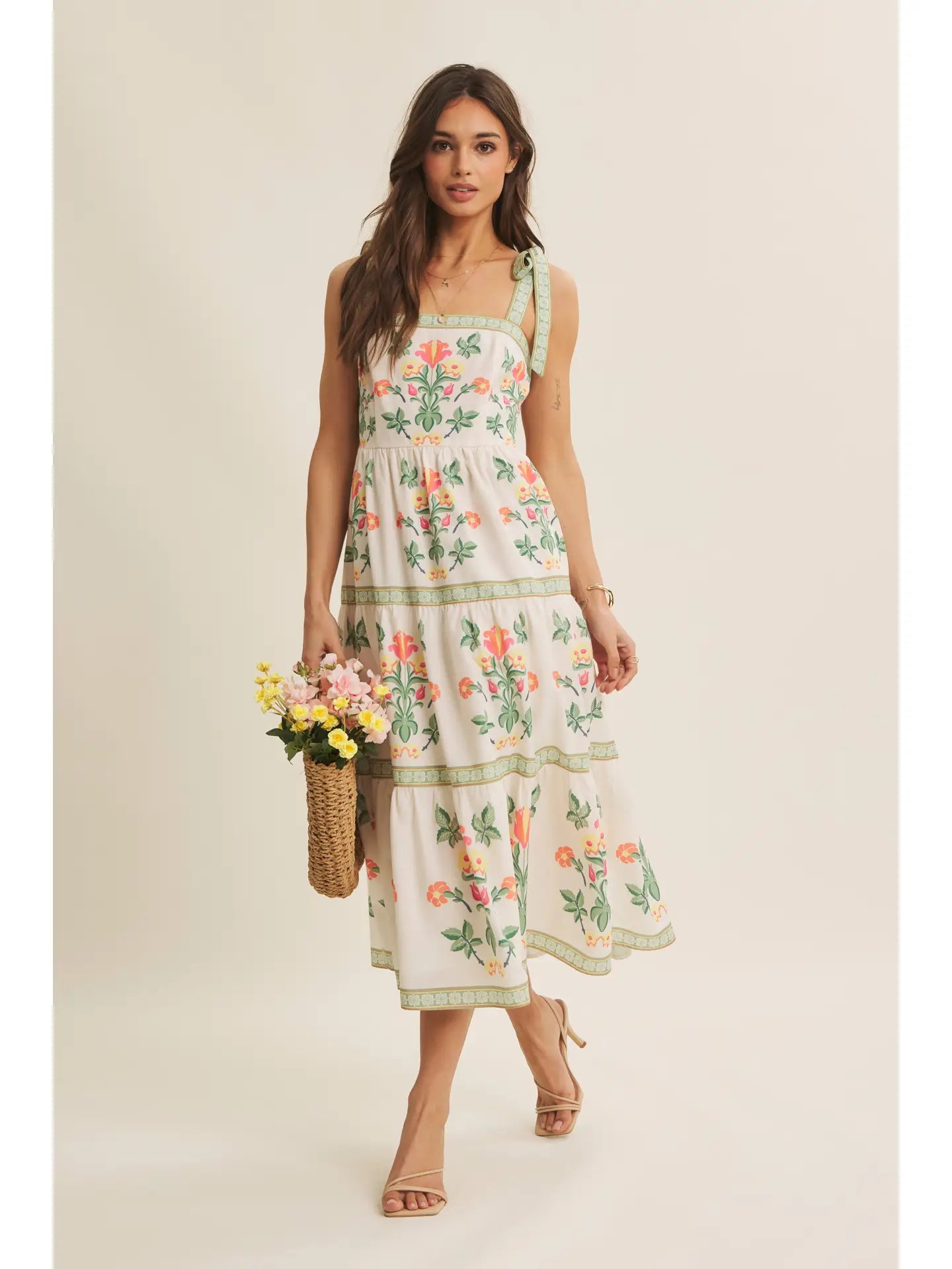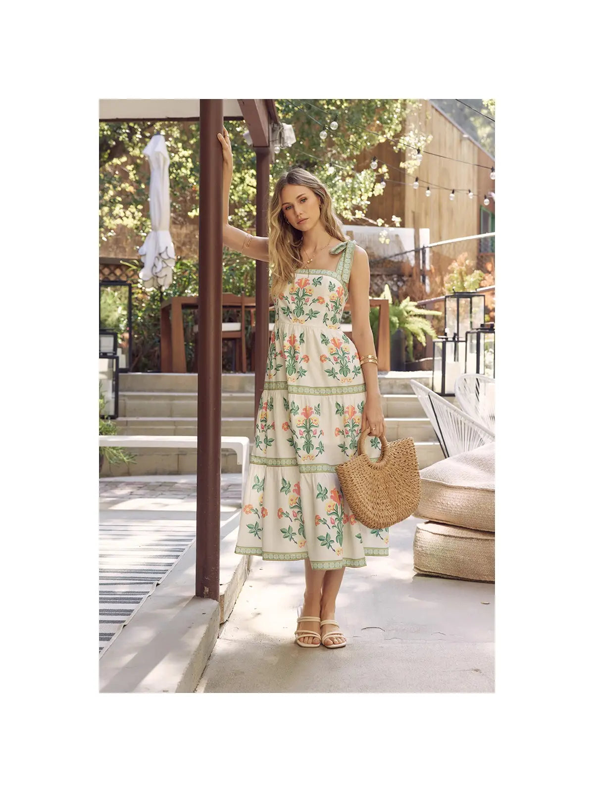 Effortless charm for sunny days. This midi dress features a delicate embroidered floral print, a breathable tiered silhouette, and light detailing along the hemlines. Narrow shoulder straps and a comfortable fit guide a breezy, feminine look that’s perfect for garden parties or weekend escapes. Pair with woven sandals and a straw bag to complete the serene, feminine vibe.